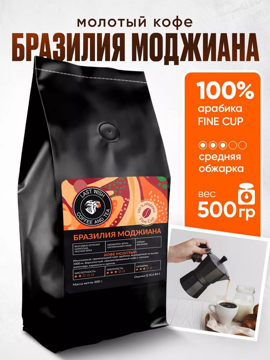LAST WISH "Бразилия Моджиана" кофе молотый 500 грамм помол для рожковой кофеварки - классика кофейного вкуса и образцовый представитель бразильского кофе. Он произрастает в одноимённом регионе Бразилии, в северной части Сан-Паулу. Кофе из этого региона традиционно отличается большей сладостью с приятным привкусом горького шоколада, фундука и лёгким нюансом апельсиновой цедры в аромате.