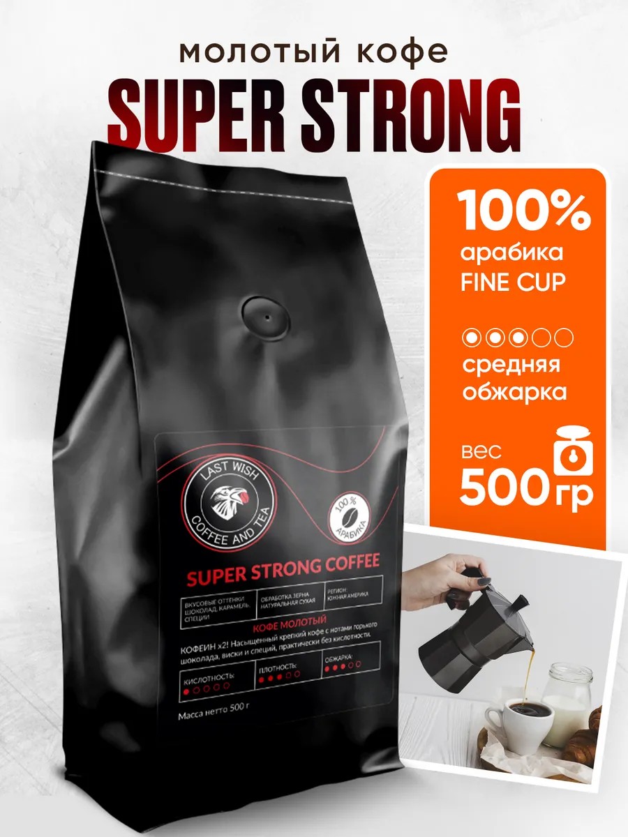 Молотый кофе 500 г универсальный помол "Super Strong" от LAST WISH! Чёрный, как следы покрышек на горячем асфальте. Крепкий, как плечо товарища. Кофейные зёрна ручной сборки премиум-класса с высокой дозой кофеина, 100% арабика. Вкусовые оттенки: горький шоколад и лесной орех. Идеальная обжарка для эспрессо. Для сильных духом и готовых к победам!