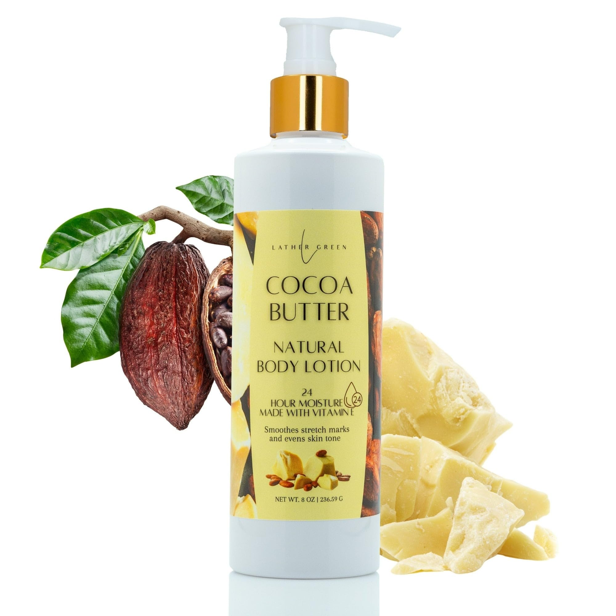 Lather Green - Cocoa Butter Natural Body Lotion Smooths Stretch Marks Deep Hydration 24-Hour Moisture 8 oz