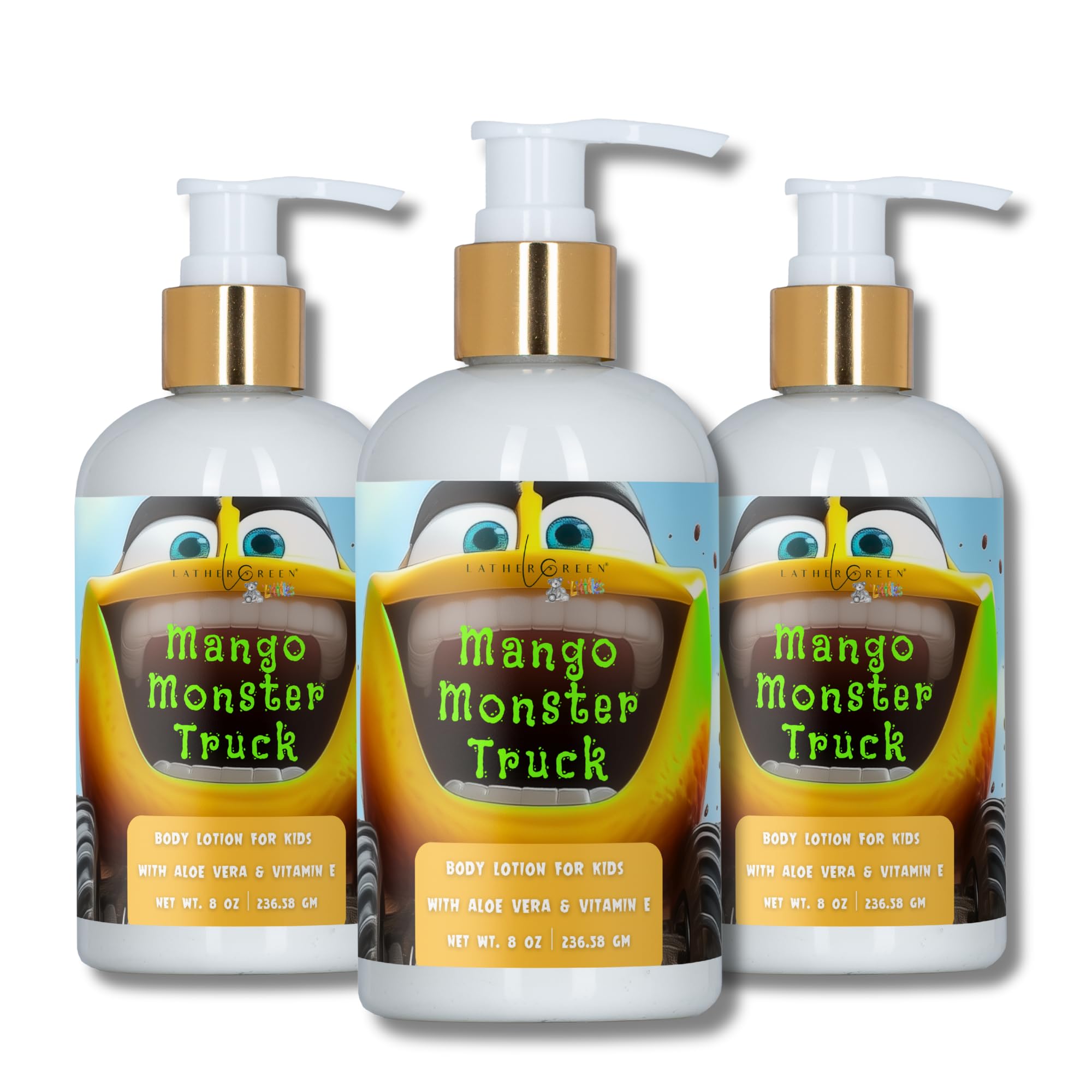 Lather Green Kids Body Lotion Plant Based Gentle Moisturizer with Shea Butter Safe for Sensitive Skin Mango Monster Truck 3 Pack (8 oz Each)