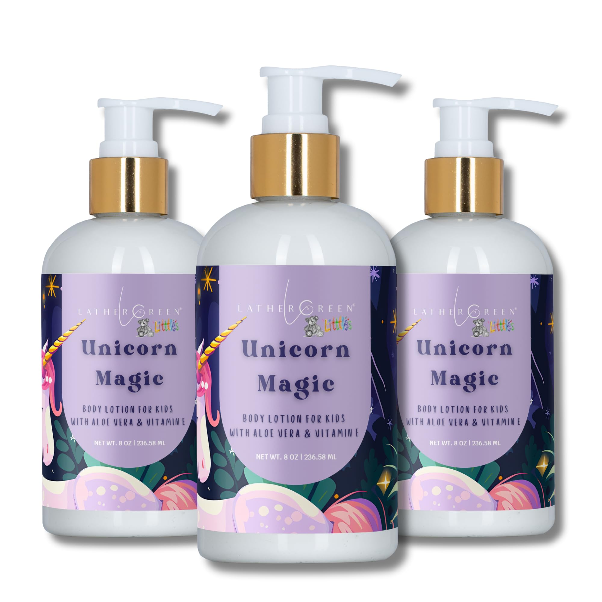 Lather Green Kids Body Lotion Plant Based Gentle Moisturizer with Shea Butter Safe for Sensitive Skin Unicorn Magic 3 Pack (8 oz Each)
