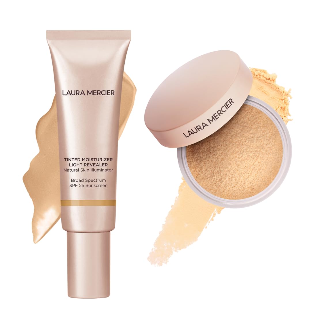 Laura Mercier Tinted Moisturizer Light Revealer with SPF 25 Luminous Finish Shade 3W1 Bisque and Translucent Loose Talc-Free Setting Powder Ultra-Blur: Hyaluronic Acid Infused Shade Translucent Ho