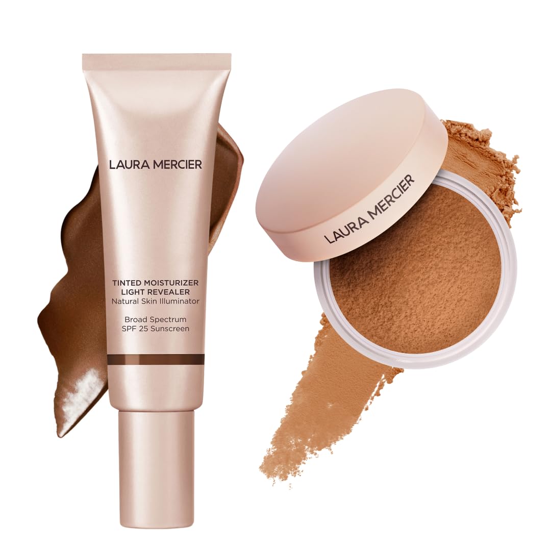 Laura Mercier Tinted Moisturizer Light Revealer with SPF 25 Luminous Finish Shade 6C1 Cacao and Translucent Loose Talc-Free Setting Powder Ultra-Blur: Hyaluronic Acid Infused Shade Medium Deep Bund
