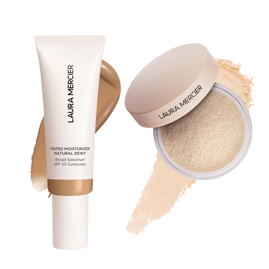 Laura Mercier Tinted Moisturizer Natural Dewy with SPF 30 24HR+ Hydration Shade 4C Hazel and Translucent Loose Talc-Free Setting Powder Ultra-Blur: Hyaluronic Acid Infused Shade Translucent Bundle