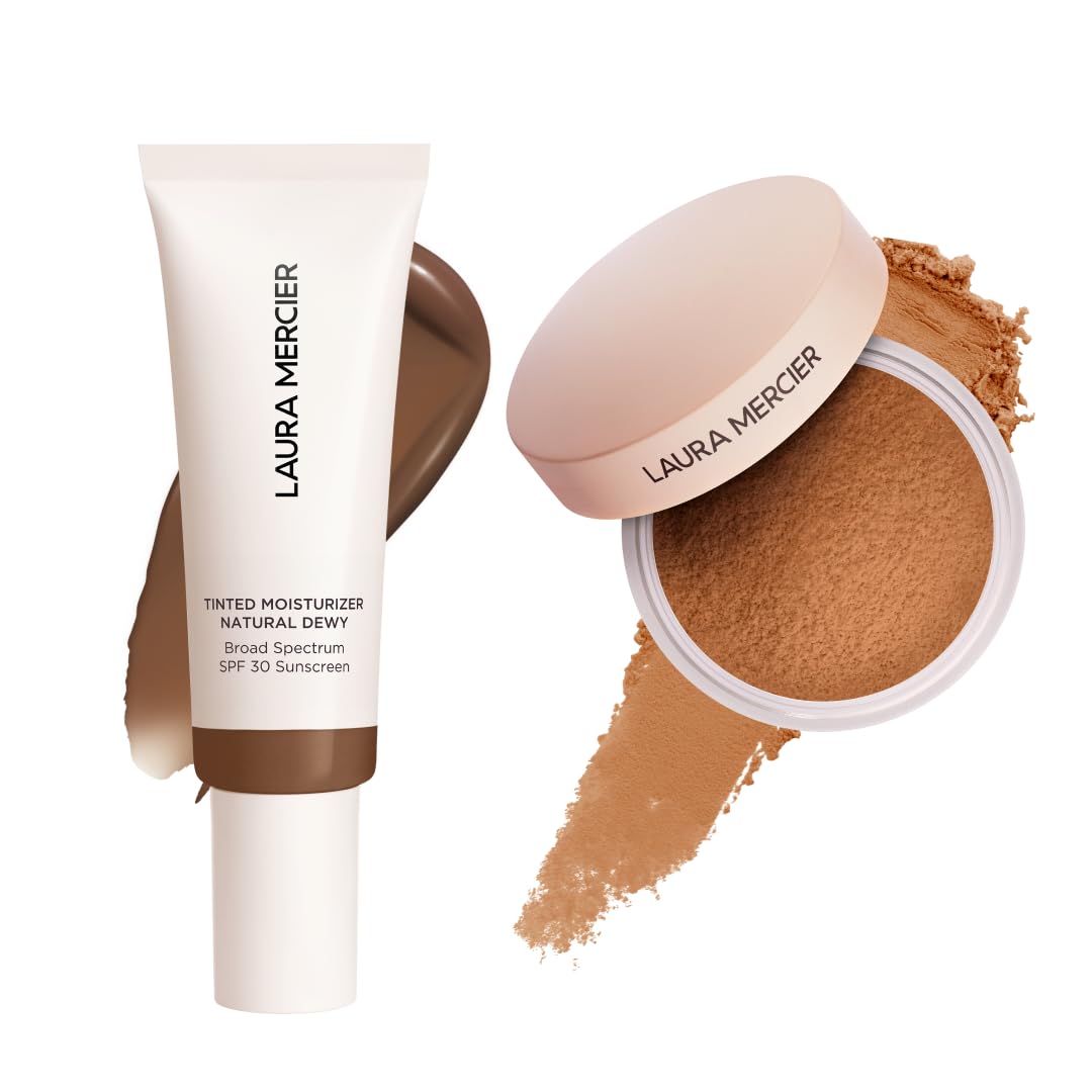 Laura Mercier Tinted Moisturizer Natural Dewy with SPF 30 24HR+ Hydration Shade 6C Brunette and Translucent Loose Talc-Free Setting Powder Ultra-Blur: Hyaluronic Acid Infused Shade Medium Deep Bund