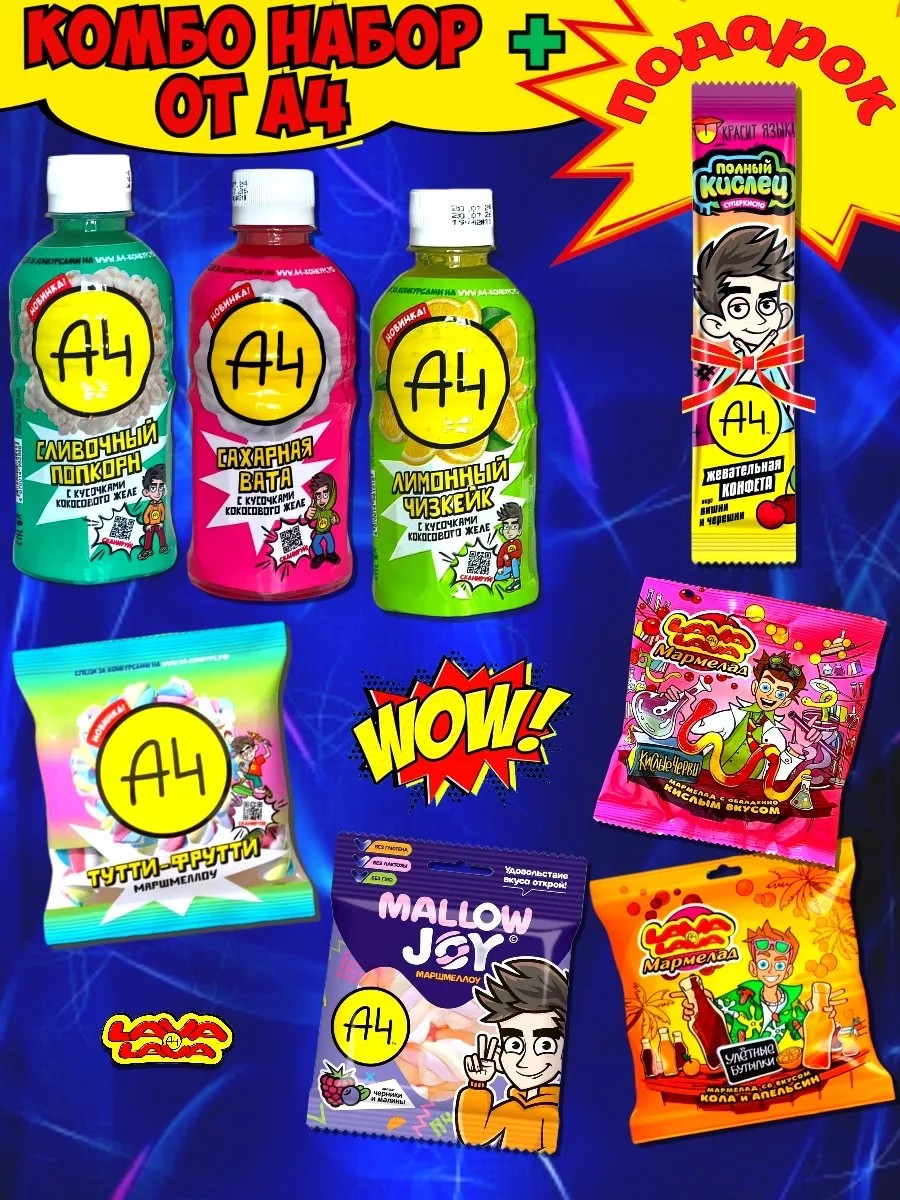 КомплектацияНапиток А4 Сахарная Вата; Напиток А4 Лимонный Чизкейк; Напиток А4 Сливочный Попкорн; Маршмеллоу А4 Тутти-Фрутти; Маршмеллоу А4 со вкусам черники и малины; Жевательная конфета А4 полный кислец; Мармелад Лава Лава со вкусам колы и апельсина; Мармелад Лава Лава Кислые Черви