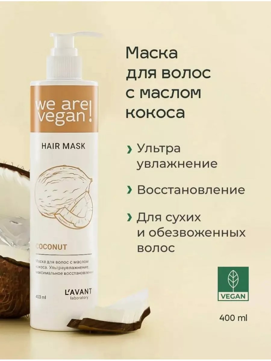 Маска для волос обеспечивает максимальное восстановление и преображение волос. Кокосовое масло в составе укрепляет локоны и увлажняет их. Масло оливы питает и защищает от повреждений. Витамин E предотвращает ломкость волос, активизирует их рост. Молочная кислота разглаживает кутикулу волоса, делает локоны более послушными. Маска we are vegan подходит для сухих и обезвоженных волос.