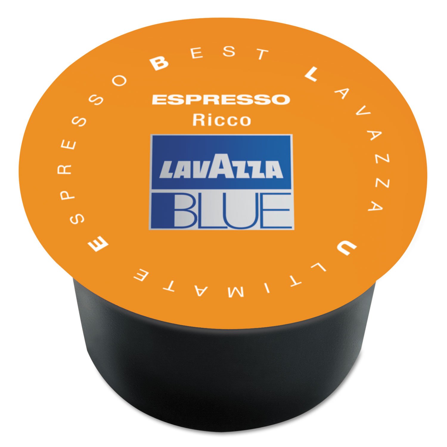 Lavazza Blue espresso capsules, Ricco-Dark Roast, 8g, 100 Box. These coffee capsules offer a variety of blends to satisfy even the most discerning palates. Individually wrapped, each capsule guarantees absolute freshness and consistent quality, cup after cup of delicious coffee. Beverage type: coffee flavor: Ricco Dark Roast packaging type: Lavazza Blue capsule capacity (weight): 8g. Ricco Blue coffee capsules beverages fluids hydration refreshments Blue espresso capsules.