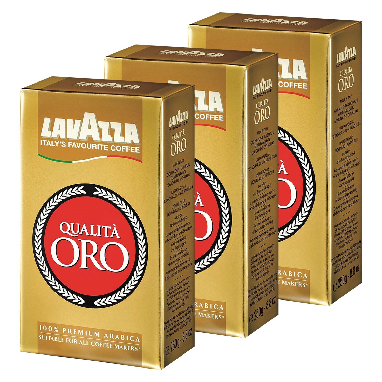Lavazza Qualità Oro is a classic among Italian espresso traditions. Power, passion—these are the virtues that make Lavazza Qualità Oro a premium coffee from Lavazza. And it has been for over half a century. In 1956, this premium espresso was created in Turin, and since then, the knowledge for this perfect coffee has been passed down through the Lavazza family from generation to generation. Treat yourself to the experience of a truly premium Italian espresso. Qualità Oro from the traditional Lavazza house is the favorite of Italians—a coffee just like you know from the best cafés in Milan or Rome. The typical golden crema, the full body, the aromatic and smooth taste of 100 Arabica espresso, and that incomparable fragrance. An exclusive espresso for connoisseurs who demand nothing less. And the best part: you can prepare it at home. Whenever and however you like. Because Lavazza Qualità Oro is suitable for all types of preparation: enjoy your coffee by hand, in an espresso machine, a drip coffee maker, a French press, or a drip coffee maker. Whether it's an espresso, a cappuccino, or a latte macchiato, the Lavazza Qualità Oro machine guarantees a perfect cup of coffee that makes every moment of the day special. Made with 100 premium Arabica espresso for a rich and smooth taste. Roast: Medium aroma: 5 out of 5 Body: 4 out of 5 Intensity: 4 out of 5. Suitable for: filter coffee machines, moka pots, French presses, and more. Ingredients: Ground roasted coffee, 100 ArabicaLavazza Café Qualit ORO, café en grains moulus (3 x 250 g)DESCRIPTION DU PRODUIT Lavazza Qualità Oro est le classique parmi la tradition italienne Espressi, pouvoirs, passion, ce sont les vertus qui font du Lavazza Qualità Oro un café haut de gamme de Lavazza. Et cela depuis plus d'un demi-siècle. En 1956, cet expresso haut de gamme a été créé à Turin et depuis lors, les connaissances pour ce café parfait sont transmises dans la famille Lavazza de génération en génération. Offrez-vous l'expérience d'un véritable expresso italien haut de gamme. Qualité Oro de la maison traditionnelle Lavazza est le préféré des Italiens un café comme vous le connaissez dans les meilleurs cafés Milan ou Roms. La crème dorée typique, le corps entier, le goût aromatique et doux de l'espresso 100 Arabica et ce parfum incomparable Un expresso exclusif pour les connaisseurs qui ne sont que suffisants. Et le meilleur : vous pouvez le préparer à la maison. Quand et comme vous l'aimez. Parce que Lavazza Qualità Oro est adapté à tous les types de préparation : dégustez le café à la main, dans la machine à expresso, dans la machine à café, la cafetière à piston ou dans la machine à café. Comme expresso, cappuccino ou latte macchiato : la machine Lavazza Qualità Oro vous garantit un petit café qui fait de chaque moment de la journée quelque chose de spécial. Expresso Arabica 100 premium pour un goût riche et doux. Torréfaction : arôme moyen : 5 sur 5 Corps : 4 sur 5 Intensité : 4 sur 5 Convient entre autres pour : machine à café à filtre - Cafetière à moka - Cafetière à piston - Ingrédients : café torréfié moulu, 100 arabica