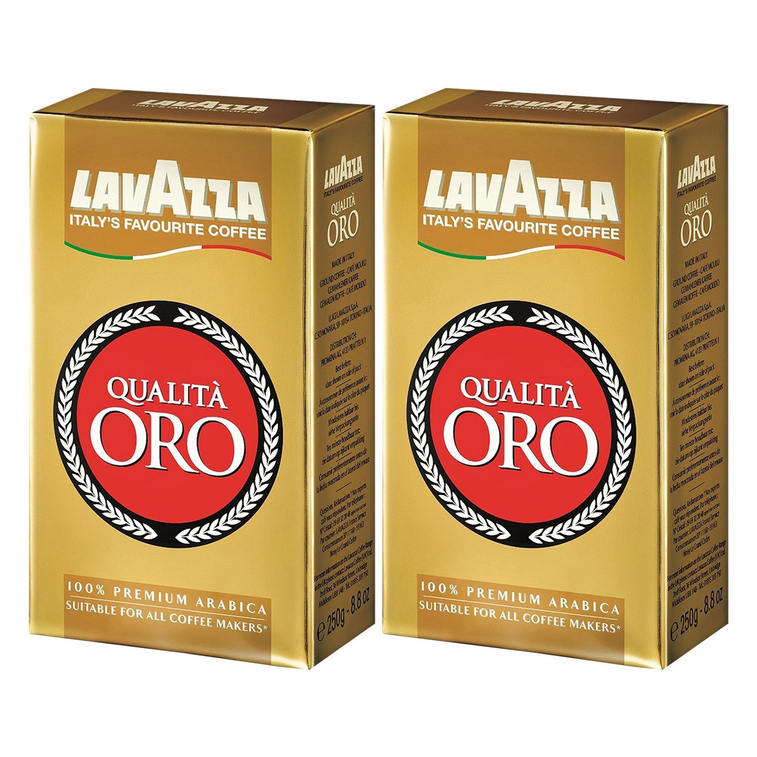Lavazza Qualità Oro is a classic among Italian espresso traditions. Power, passion—these are the virtues that make Lavazza Qualità Oro a premium coffee from Lavazza. And it has been for over half a century. In 1956, this premium espresso was created in Turin, and since then, the knowledge for this perfect coffee has been passed down through the Lavazza family from generation to generation. Treat yourself to the experience of a truly premium Italian espresso. Qualità Oro from the traditional Lavazza house is the favorite of Italians—a coffee just like you know from the best cafés in Milan or Rome. The typical golden crema, the full body, the aromatic and smooth taste of 100 Arabica espresso, and that incomparable fragrance. An exclusive espresso for connoisseurs who demand nothing less. And the best part: you can prepare it at home. Whenever and however you like. Because Lavazza Qualità Oro is suitable for all types of preparation: enjoy your coffee by hand, in an espresso machine, a drip coffee maker, a French press, or a drip coffee maker. Whether it's an espresso, a cappuccino, or a latte macchiato, the Lavazza Qualità Oro machine guarantees a perfect cup of coffee that makes every moment of the day special. Made with 100 premium Arabica espresso for a rich and smooth taste. Roast: Medium aroma: 5 out of 5 Body: 4 out of 5 Intensity: 4 out of 5. Suitable for: filter coffee machines, moka pots, French presses, and more. Ingredients: Ground roasted coffee, 100 ArabicaLavazza Café Qualit ORO, café en grains moulus (2 x 250 g)DESCRIPTION DU PRODUIT Lavazza Qualità Oro est le classique parmi la tradition italienne Espressi, pouvoirs, passion, ce sont les vertus qui font du Lavazza Qualità Oro un café haut de gamme de Lavazza. Et cela depuis plus d'un demi-siècle. En 1956, cet expresso haut de gamme a été créé à Turin et depuis lors, les connaissances pour ce café parfait sont transmises dans la famille Lavazza de génération en génération. Offrez-vous l'expérience d'un véritable expresso italien haut de gamme. Qualité Oro de la maison traditionnelle Lavazza est le préféré des Italiens un café comme vous le connaissez dans les meilleurs cafés Milan ou Roms. La crème dorée typique, le corps entier, le goût aromatique et doux de l'espresso 100 Arabica et ce parfum incomparable Un expresso exclusif pour les connaisseurs qui ne sont que suffisants. Et le meilleur : vous pouvez le préparer à la maison. Quand et comme vous l'aimez. Parce que Lavazza Qualità Oro est adapté à tous les types de préparation : dégustez le café à la main, dans la machine à expresso, dans la machine à café, la cafetière à piston ou dans la machine à café. Comme expresso, cappuccino ou latte macchiato : la machine Lavazza Qualità Oro vous garantit un petit café qui fait de chaque moment de la journée quelque chose de spécial. Expresso Arabica 100 premium pour un goût riche et doux. Torréfaction : arôme moyen : 5 sur 5 Corps : 4 sur 5 Intensité : 4 sur 5 Convient entre autres pour : machine à café à filtre - Cafetière à moka - Cafetière à piston - Ingrédients : café torréfié moulu, 100 arabica