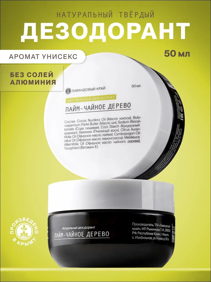 Представляем вам сухой дезодорант от ТМ Лавандовый Край, который эффективно защищает от запаха пота и обеспечивает ощущение свежести на весь день. Благодаря особым органическим компонентам в составе, он снижает потоотделение и оказывает антибактериальное действие, препятствуя размножению бактерий и грибков, которые являются причиной неприятного запаха у взрослых и подростков. Освежающий ненавязчивый аромат лайма и лемонграсса подходит для мужчин и женщин, мальчиков и девочек. Особенностью нашего твердого дезодоранта является его природный состав, полностью натуральный и безопасный для здоровья. В нем нет хлоридов алюминия, парабенов и других вредных веществ, которые могут вызывать раздражение кожи подмышек. Он не содержит консервантов, синтетических отдушек и спирта, что делает эко средство идеальным выбором для детей и людей с чувствительной кожей. Не является антиперспирантом, поэтому не блокирует потовые железы, обеспечивая правильную работу организма. Используя наш содовый дезодорант, вы можете быть уверены в своей свежести и комфорте на протяжении всего дня. Оригинальная уходовая крымская косметика от ТМ Лавандовый край – это гарантия качества, безопасности и эффективности.
