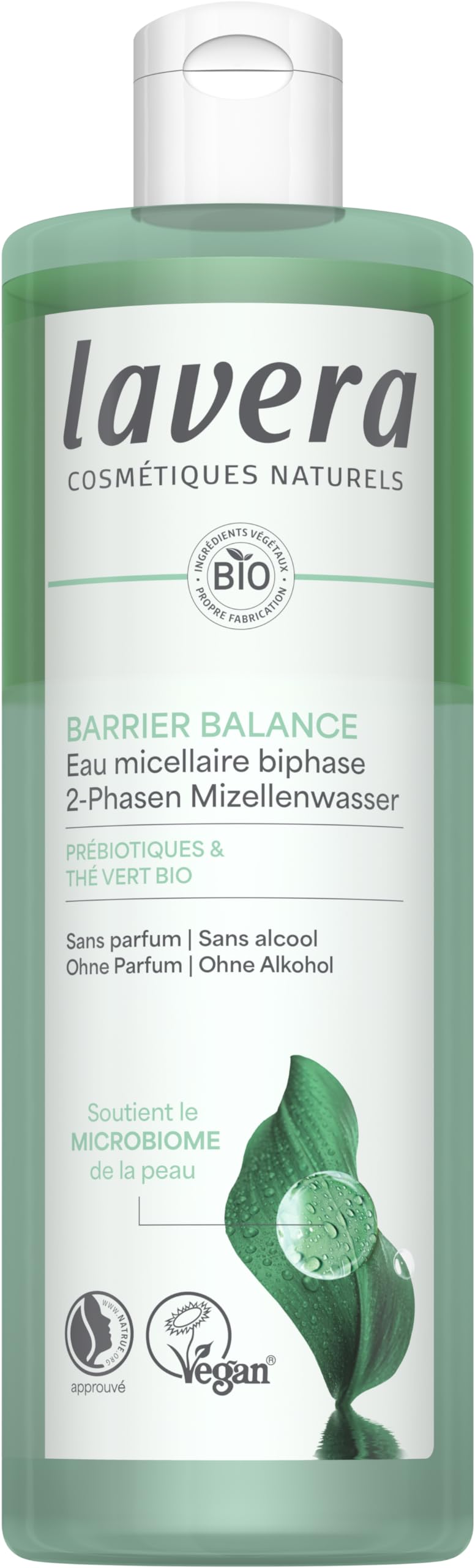 lavera Barrier Balance Eau micellaire biphasée - sans alcool - sans parfum - dissout le maquillage résistant à l'eau - douce pour la barrière cutanée - prébiotique - vegan - Naturkosmetik - 400 mlDESCRIPTION DU PRODUIT DESCRIPTION DU PRODUIT L'eau micellaire Barrier Balance innovante est particulièrement douce pour la barrière cutanée et le microbiome. Élimine en profondeur le maquillage, même le maquillage résistant à l'eau, et les impuretés en un seul geste. Sans parfum ni alcool. Le début parfait de ta nouvelle routine prébiotique. INGRÉDIENTS Water (Aqua), Dodecane, Glycine Soja (Soybean) Oil , Pentylene Glycol, Glycerin, Lactobacillus Helianthus Tuberosus Tuber Ferment Extract , Amaranthus Caudatus Seed Extract , Camellia Sinensis Leaf Extract , Lactococcus Ferment Lysate, Lactobacillus Camellia Sinensis Leaf Extract Zingiber Officinale (Ginger) Root Extract Ferment Filtrate, Opuntia Ficus-Indica Stem Extract, Maltodextrin, Helianthus Annuus (Sunflower) Seed Oil, Tocopherol, Chlorophyllin-Copper Complex (CI 75810), Sea Salt (Maris Sal), Levulinic Acid, Sodium Levulinate, Sodium Hydroxide, Glycolipids, Lactic Acid, Sodium Chloride, Phenylpropanol, Sodium Lactate ingredients from certified organic agriculture ingrédients issus de l'agriculture biologique certifiée AVERTISSEMENT DE SÉCURITÉ Éviter le contact avec les yeux. Ne convient pas à la consommation. Voir plusSans parfum ni alcool. Dissout également le maquillage waterproof. Élimine en profondeur le maquillage et les particules de saleté. Nettoyage en douceur. Doux pour la barrière cutanée et le microbiome.