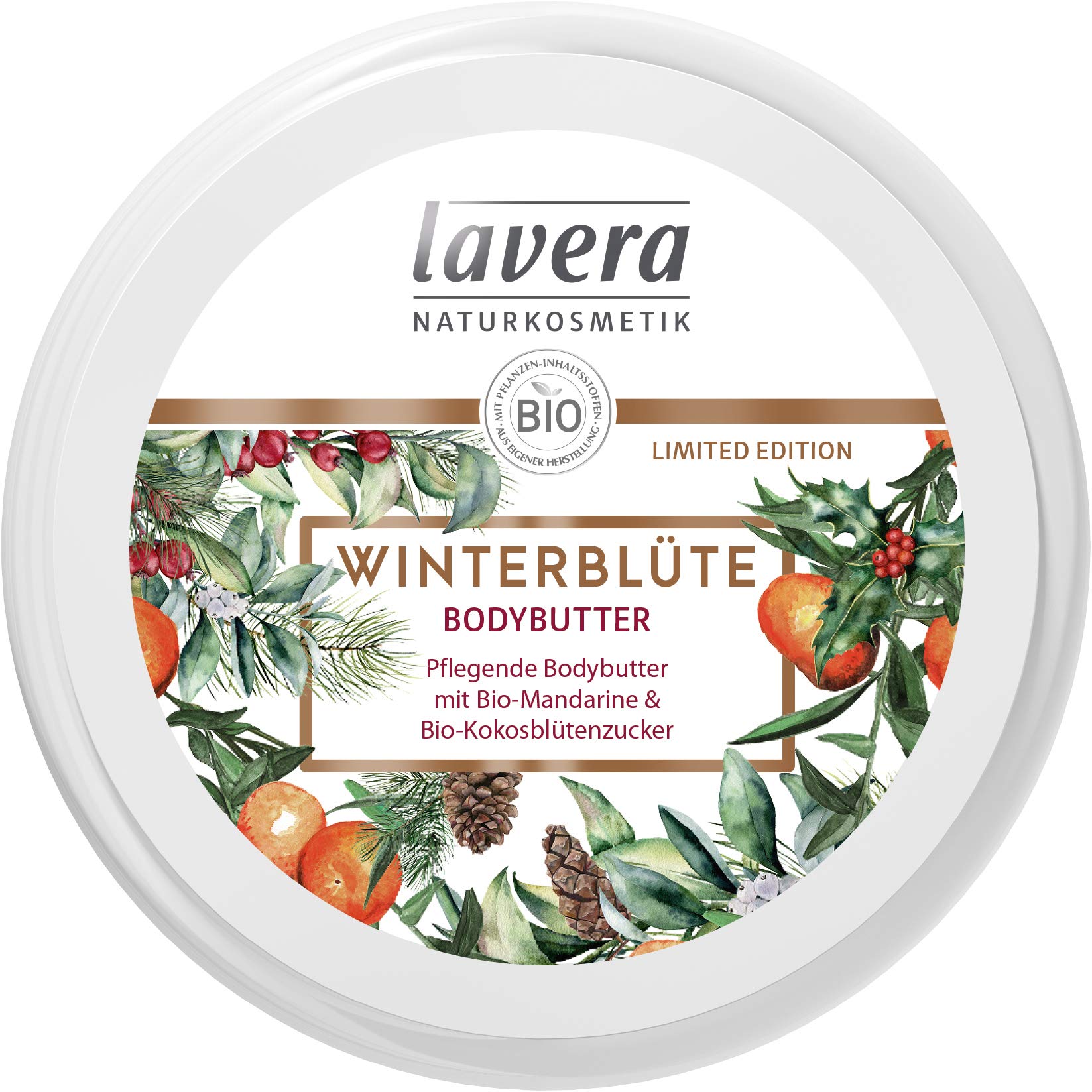 Pflegende Bodybutter mit Bio-Mandarine & Bio-Kokosblütenzucker. Limited Edition - Natürliche Winterpflege mit Verwöhnfaktor. Die reichhaltige lavera Winterblüte Bodybutter mit fruchtig-blumigem Winterduft verwöhnt unsere Haut. Gerade in der kalten Jahreszeit benötigt unsere Haut viel Pflege: Sheabutter, wertvolle Bio-Öle und natürliche Pflanzenextrakte spenden Feuchtigkeit - der winterliche Duft berührt unsere Sinne. Vegan, Bio und 100% NATRUE zertifiziert! lavera Naturkosmetik - über 25 Jahre Erfahrung. 100% natürliche Zutaten aus kontrolliertem Anbau. lavera Kosmetik steht für natürliche Schönheitspflege und schenkt Ihnen das ganze Jahr ein schönes Hautgefühl – allein durch die Kraft der Natur – made in Germany. 100 % zertifizierte Naturkosmetik mit natürlichen Pflanzenwirkstoffen & Bio-Pflanzenauszügen oder Bio-Ölen. 100 % aus einer Hand in Deutschland entwickelt und produziert 100 % natürliche Düfte und Aromen 100 % frei von synthetischen Konservierungsstoffen 100 % hautmilde Emulgatoren & Tenside auf Pflanzenbasis 100 % frei von Silikonen, Paraffinen & Mineralöl ANSCHRIFT HERSTELLER/IMPORTEUR D-30974 Wennigsen