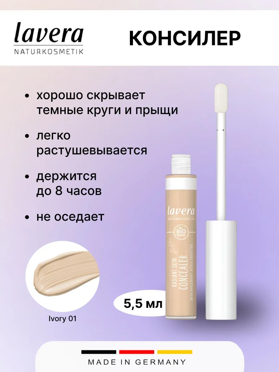 Консилер Lavera NATURKOSMETIK - Ivory 01, 5,5 мл. Откройте для себя секрет сияющей кожи с консилером от Lavera. Он эффективно маскирует темные круги и прыщи, не утяжеляя макияж и оставляя естественный оттенок. Нежная текстура легко растушевывается, создавая безупречный вид, и позволяет наращивать покрытие по вашему желанию. Особенности