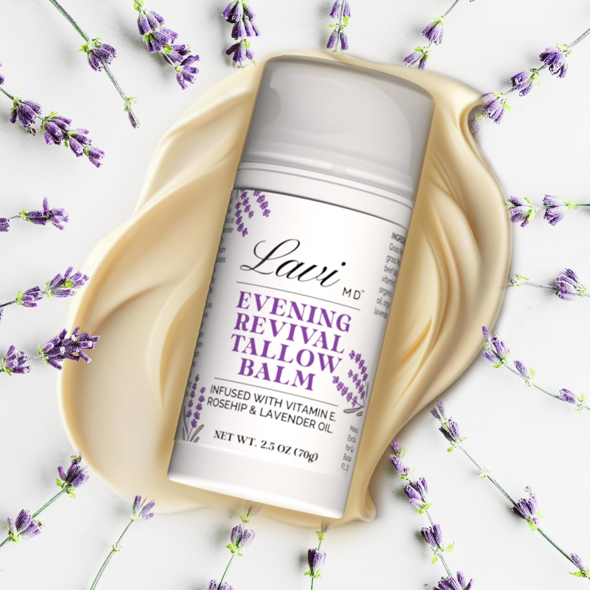 "Wind down your day with calm, restorative skincare. LaviMD Evening Revival Tallow Balm combines the time-honored hydration of 100 grass-fed beef tallow with organic lavender oil, organic rosehip oil, and vitamin E. This whipped blend melts into skin, delivering lasting moisture while the natural lavender aroma encourages a soothing evening atmosphere. Designed for dry, sensitive, or stressed skin, it restores softness and balance to the face, body, and hands without leaving a greasy feel. Free of synthetic fragrances and made only with nutrient-rich, natural ingredients, this balm supports skin's overnight renewal for a refreshed, healthy-looking glow. Handcrafted in small batches in the USA, this 2.5oz balm is produced in an FDA-registered, GMP-certified facility and third-party tested for quality and purity—so you can trust every jar."Trusted Quality, Made in the USA: LaviMD's Evening Revival Tallow Balm is handcrafted in small batches using premium ingredients. Produced in an FDA-registered, GMP-certified facility, and third-party tested for purity and effectiveness. Gentle and Versatile for All Ages: Works beautifully as a whipped tallow face moisturizer, body butter, or part of men's and women's evening skincare routines. Suitable for all skin types. Nutrient-Rich Botanical Support: Rosehip oil and vitamin E provide natural antioxidants and skin-nourishing benefits, leaving skin feeling smooth, balanced, and refreshed. Lavender-Infused for Evening Relaxation: Enriched with organic lavender oil, rosehip oil, and vitamin E, this calming blend pampers your skin while offering a light floral aroma that helps create a soothing nighttime ritual. Whipped Tallow Cream for Face and Body: Made from 100 grass-fed beef tallow, this whipped balm melts into your skin, delivering deep hydration with a soft, breathable finish. Perfect for dry and sensitive skin in need of evening nourishment.