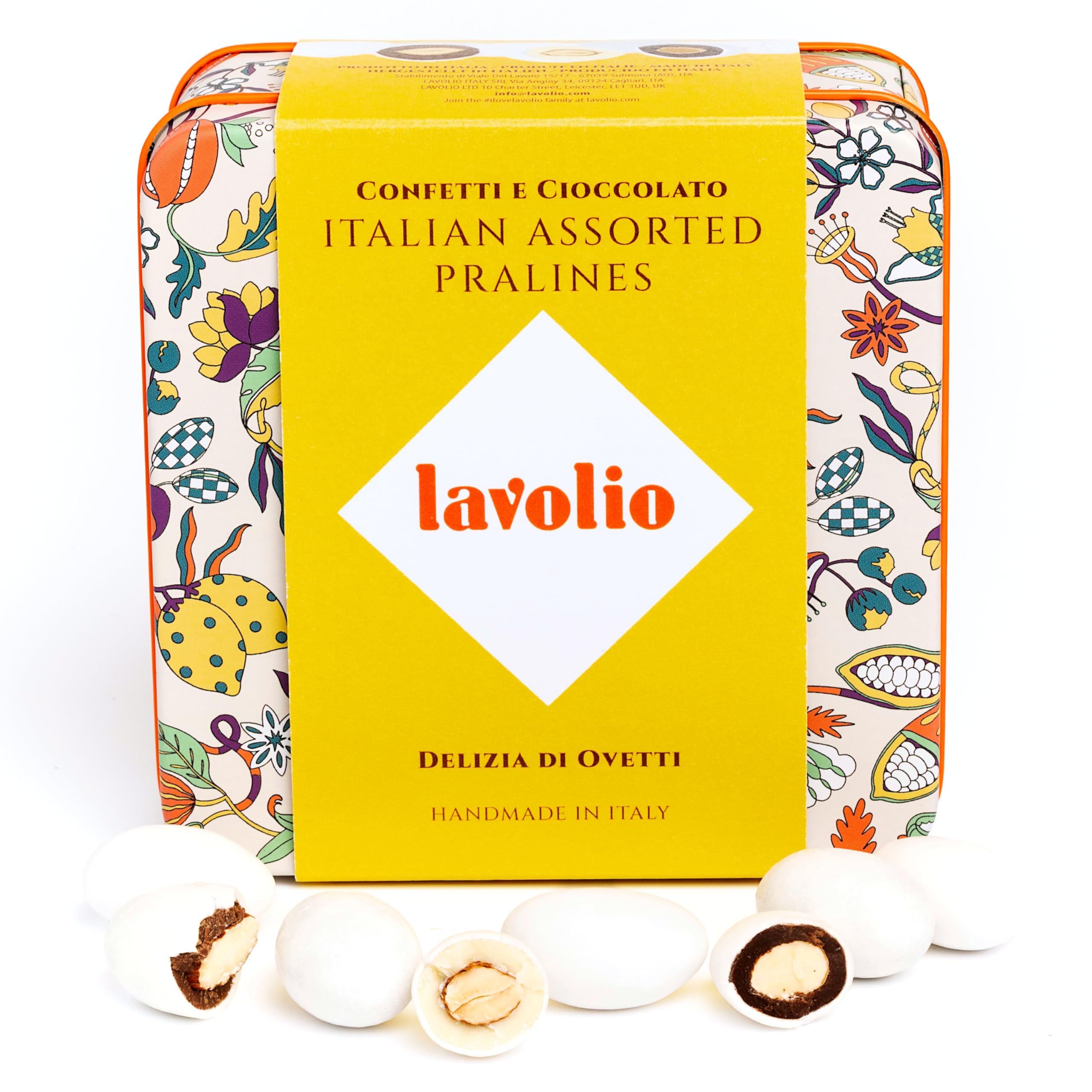 Lavolio Nutty Mini Eggs est un mélange divin de noix et de chocolat, fabriqué à la main en Italie par des artisans. Chaque bonbon a un look et un goût uniques. À l'intérieur de chaque mini œuf blanc, vous découvrirez les meilleures amandes grillées enrobées de trois types différents de délicieux chocolat : Chocolat noir, chocolat Gianduia aux noisettes et chocolat Amaretto blanc.
