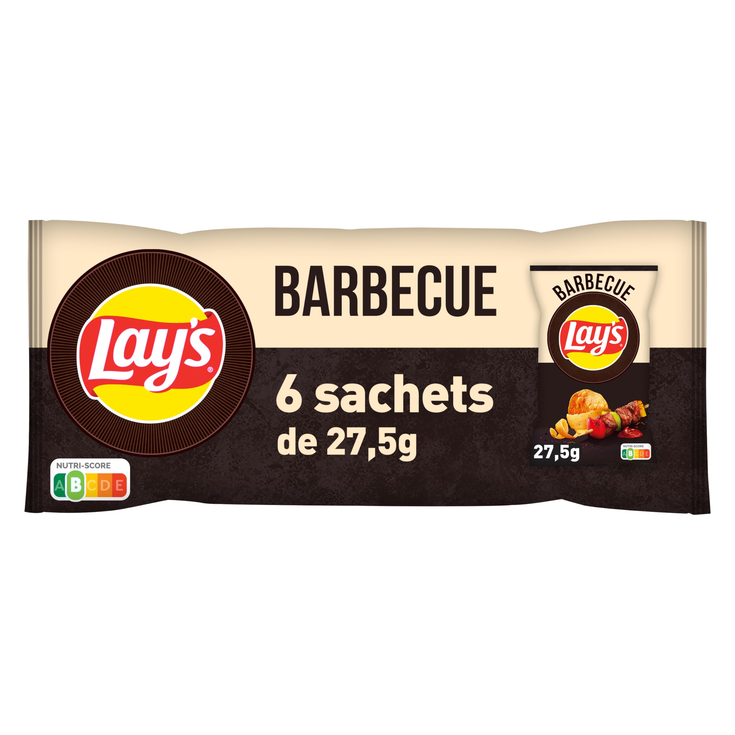 Since 1932, Lay's has been dedicated to bringing you delicious flavored chips for every occasion. Whether it's for an aperitif, a picnic, a summer barbecue, or on the go to complement a sandwich, Lay's is there to make each moment even better! Lay's, the chip expert, puts all its expertise into quality to offer you tasty chips. It all starts with its partner farmers who carefully select their potatoes to guarantee exceptional taste and crispiness. Lay's is committed to making its chips through a simple process: selected, washed, peeled, fried, seasoned, and packaged. All without artificial colors or preservatives. Enjoy a variety of flavors! Discover other Lay's flavors to share: Lay's Plain - Lay's Country Style - Lay's Old School - Lay's Barbecue Flavor - Lay's Bolognese Flavor - Lay's Spicy Flavor - Roast Chicken Flavor - Mustard Flavored Pickles - Emmental Flavor - Max Plain - Max Flavor Sauce - Barbecue Spicy: spicy Pickles: Condiments To preserve all the flavors and crispness of your chips, it is recommended to store them away from heat and humidity. INGREDIENTS Potatoes (62 ), vegetable oils (sunflower, rapeseed, corn in varying proportions), barbecue flavouring base [sugar, salt, flavouring (including soy), paprika powder, dextrose, onion powder, tomato powder, garlic powder, acidity regulators (malic acid, citric acid), locust bean gum, colour (paprika extract), maltodextrin, smoked sunflower oil]. STORAGE INSTRUCTIONS Store away from heat and moisture. See moreLay's Copeaux de barbecue 27,5 g - Multipack de 6DESCRIPTION DU PRODUIT DESCRIPTION DU PRODUIT Depuis 1932, Lay's a pour mission de vous apporter de délicieuses chips aromatisées pour toutes les occasions. Que ce soit pour l'apéritif, un pique-nique, un barbecue d'été ou en déplacement pour compléter un sandwich : Lay's vous accompagne à chacun de ces moments pour les rendre encore meilleurs ! Lay's, expert en chips, met tout son savoir-faire au service de la qualité pour vous proposer de savoureuses chips. Tout commence avec ses agriculteurs partenaires qui sélectionnent soigneusement leurs pommes de terre pour vous garantir un goût et un croustillant exceptionnels. Lay's s'engage à fabriquer ses chips par un processus simple : sélectionné, lavé, pelé, frites, assaisonné, emballé. Le tout sans colorants artificiels ni conservateurs. Variez les plaisirs ! Découvrez d'autres saveurs Lay's à partager : Lay's Nature - Lay's Paysannes - Lay's à l'Ancienne - Saveur Lay's Barbecue - Saveur Lay's bolognaise - Saveur Lay's épicée - Saveur poulet rôti - cornichons saveur moutarde - saveur Emmental - Max Nature - Sauce Max Flavour - Barbecue Épicé : épicé Pickles: Condiments Pour préserver toutes les saveurs et le croustillant de vos puces, il Il est recommandé de les ranger à l'abri de la chaleur et de l'humidité. INGRÉDIENTS Pommes de terre (62 ), huiles végétales (tournesol, colza, maïs dans des proportions variables), base aromatisante pour barbecue [sucre, sel, arôme (y compris le soja), poudre de paprika, dextrose, poudre d'oignon, poudre de tomate, poudre d'ail, régulateurs d'acidité (acide malique, acide citrique), farine de graines de caroube, colorant (extrait de paprika), maltodza extrine fumée, huile Tournesol fumé ]. MODE D'EMPLOI Conserver à l'abri de la chaleur et de l'humidité. Voir plus