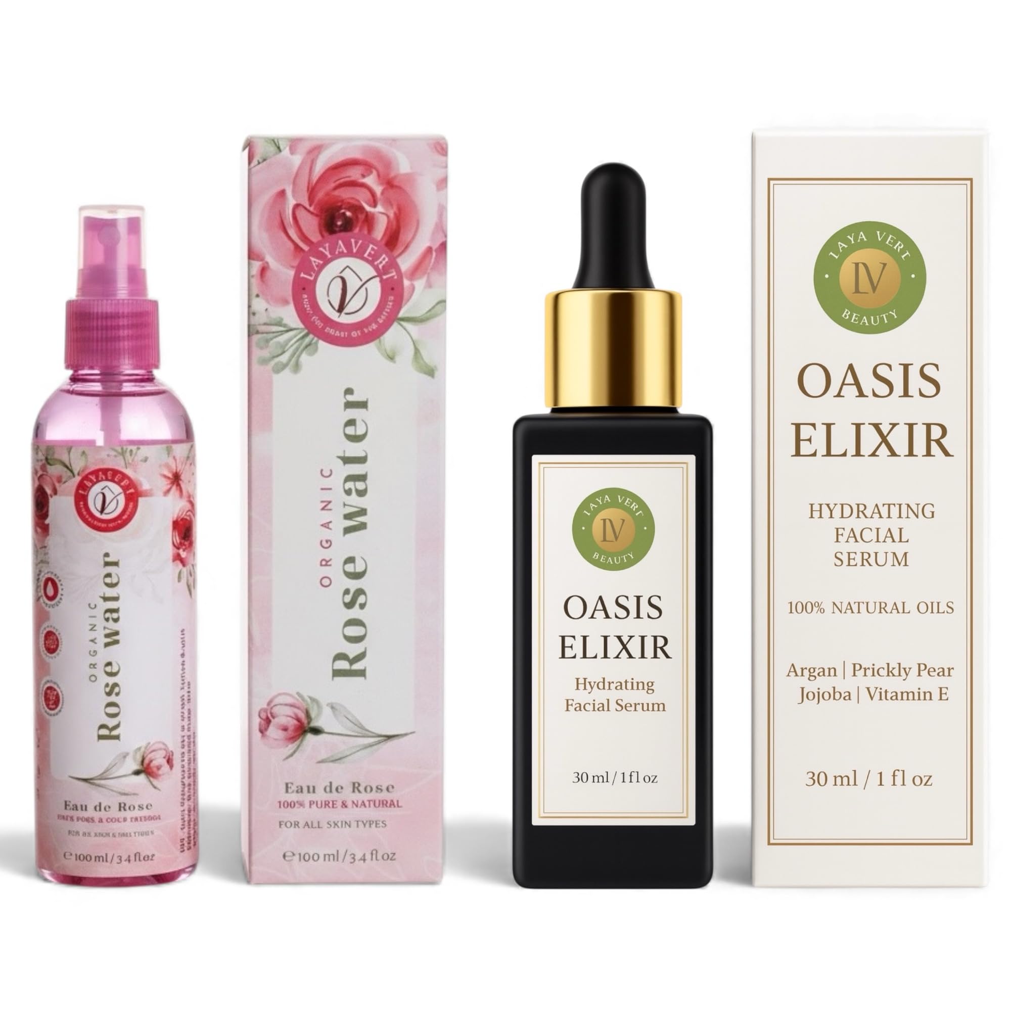 Discover the secret behind luminous, youthful-looking skin with the LAYA VERT Moroccan Hydration Duo, a complete two-step ritual designed to deliver deep hydration, visible smoothness and a healthy glow. This luxurious routine combines Organic Rose Water with our Oasis Elixir face serum for a spa-like experience at home. STEP 1 – ORGANIC ROSE WATER (100 ml 3.4 fl oz) This premium, steam-distilled organic rose water from Morocco gently tones, refreshes and brightens the complexion. The ultra-fine mist instantly awakens tired skin, restoring comfort and hydration while helping to calm feelings of redness and tightness. It acts as a natural facial toner, helping refine the look of pores, enhance clarity and prepare the skin to receive your serum. STEP 2 – OASIS ELIXIR FACE SERUM (30 ml 1 fl oz) A concentrated blend of certified organic prickly pear seed oil, certified organic argan oil, jojoba oil and vitamin E. Rich in antioxidants and essential fatty acids, this lightweight oil serum deeply nourishes and supports the skin's natural elasticity. With regular use it helps soften the appearance of fine lines, improve firmness, even out skin tone and restore a smoother, brighter, more youthful-looking complexion. PERFECT HARMONY OF HYDRATION NOURISHMENT Used together, Organic Rose Water and Oasis Elixir create a complete Moroccan beauty ritual that boosts hydration, strengthens the skin barrier and brings back a fresh, healthy glow. Ideal for dry, normal, sensitive and combination skin types. CLEAN, CONSCIOUS FORMULA Made with certified organic argan oil, certified organic prickly pear seed oil and certified organic rose water under USDA EU organic standards. 100 natural oils. Free from parabens, mineral oils, silicones, sulfates and synthetic fragrance. Gentle enough for daily use, morning and evening.Premium Duo Size Complete hydrating facial set Includes Oasis Elixir Serum (30 ml 1.01 fl oz) Rose Water Toner (100 ml 3.38 fl oz), making it the ideal skincare gift set or self-care ritual. HOW TO USE Mist Organic Rose Water onto clean face, neck and décolleté, then apply 3–5 drops of Oasis Elixir while skin is slightly damp use morning and evening for best result. CLEAN, SKIN-LOVING FORMULA 100 natural oils, no parabens, no mineral oil, no silicones, no sulfates and no synthetic fragrance suitable for dry, normal, sensitive and combination skin. DEEP NOURISHMENT ANTI-AGING LOOK Rich in antioxidants and essential fatty acids to help soften the look of fine lines, improve firmness and restore a smoother, more even, youthful-looking complexion. CERTIFIED ORGANIC INGREDIENTS Made with certified organic argan oil, certified organic prickly pear seed oil and certified organic rose water under USDA EU organic standards. COMPLETE MOROCCAN HYDRATION RITUAL Two-step face care set with Oasis Elixir face serum and Organic Rose Water toner for deep hydration, radiance and a daily spa-like glow.