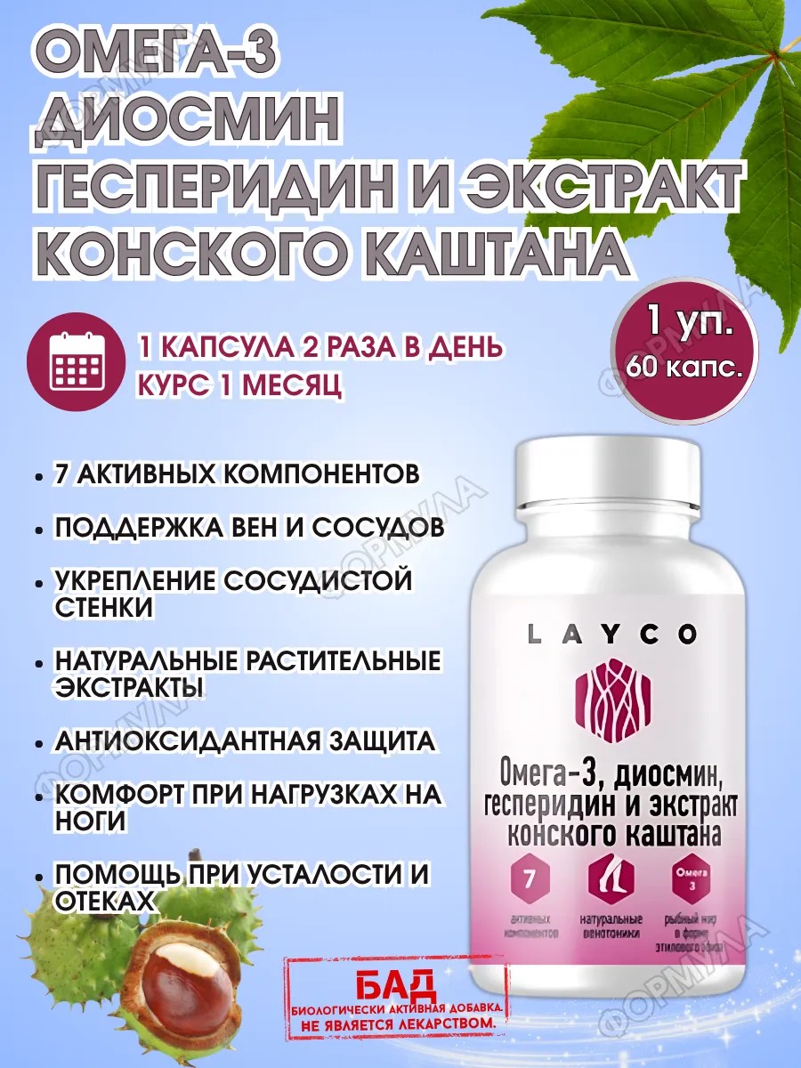 | Полное наименование товара | Омега-3, диосмин, гесперидин и экстракт конского каштана, 60 капсул Layco |