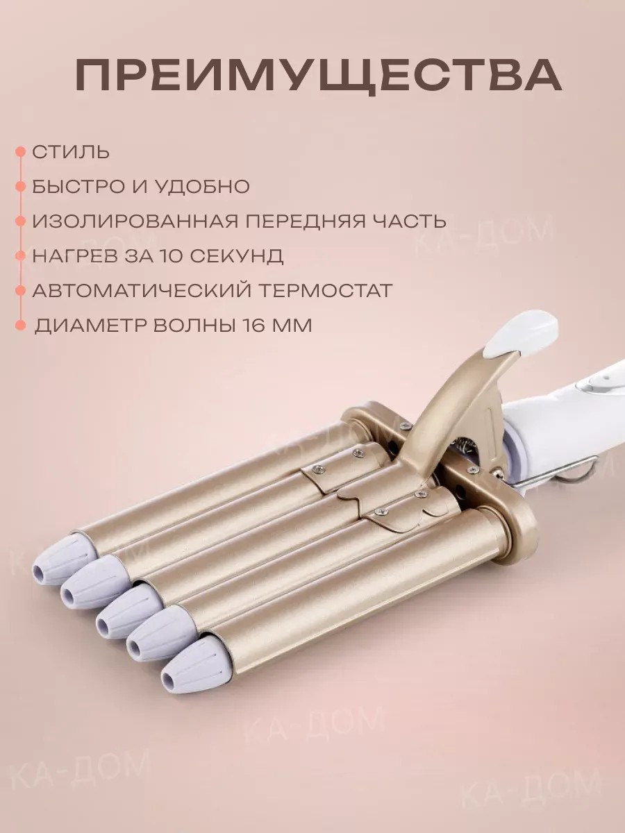 Эта плойка с пятью волнами — отличный помощник для создания различных укладок. Она компактная, удобная в использовании и подходит как для завитков, так и для волн. Пользоваться ей очень просто и безопасно: достаточно нескольких минут, чтобы преобразить свои волосы. После укладки стоит зафиксировать образ лаком или гелем — и готово! В результате у вас получится стильная прическа, похожая на те, что делают голливудские звёзды. Плойка оснащена керамическим покрытием, которое медленно и равномерно нагревается, благодаря чему волосы не подвергаются перегреву и получают меньше вреда по сравнению с металлическими устройствами. Головка плойки очень удобная и позволяет закручивать крупные пряди, а безопасная конструкция предотвращает ожоги. Шнур очень подвижен и вращается на 360 градусов, что делает процесс укладки максимально комфортным. Такую плойку можно смело подарить маме или любимой девушке — она обязательно оценит!