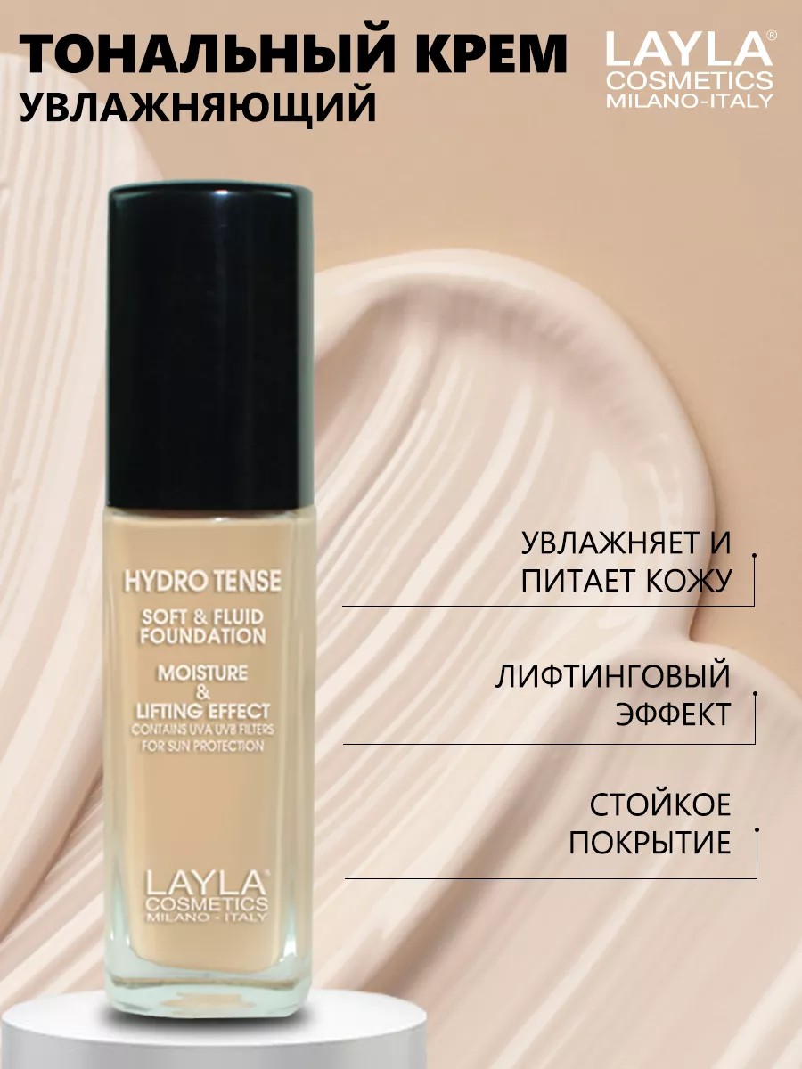 Эта тональная основа - флюид. Вы не почувствуете, что у вас на лице тональный крем, и никто не заметит, что ваши несовершенства замаскированы. Роскошная увлажняющая тональная основа – флюид создает на поверхности кожи тончайшую вуаль, которая скроет следы усталости, веснушки, тоненькие морщинки, покраснения и постакне. Если у вас нормальная или жирная кожа, лицу не хватает тонуса, вы не любите тяжелые текстуры, есть видимые несовершенства - идеальный выбор для вас Тональная основа с лифтинговым эффектом Hydro Tense Foundation от Layla Cosmetics Италия. Увлажняющая тональная основа для лица - флюид подходит для обладательниц нормальной и жирной кожи. Кроме отменных маскирующих качеств, тональная основа отлично увлажняет и питает кожу, даря ей ощущение комфорта в течение длительного времени. При этом покрытие скрывает даже видимые недостатки и создает эффект лифтинга на несколько часов. Уникальное сочетание тональник флюид – вы не ощущаете на лице ничего, никто не видит, что на вас тональное средство – при этом ваша кожа выглядит идеально ровной и подтянутой. Комфортную текстуру высокой степени покрытия при необходимости можно сделать более легкой при помощи влажного спонжа или кисти. Тональное средство подходит для проблемной кожи всех видов, для жирной кожи лица, таже это матирующий тональный крем от пигментации. Тональный крем для лица обладает самой востребованной легкой шелковистой текстурой. Получается и тоналка для лица - классика жанра крем перед макияжем - с содержанием тонирующих пигментов, который обычно служит для получения оптического эффекта: маскирует покраснения и несовершенства, выравнивает тон и рельеф кожи. И увлажняющий крем питательный.