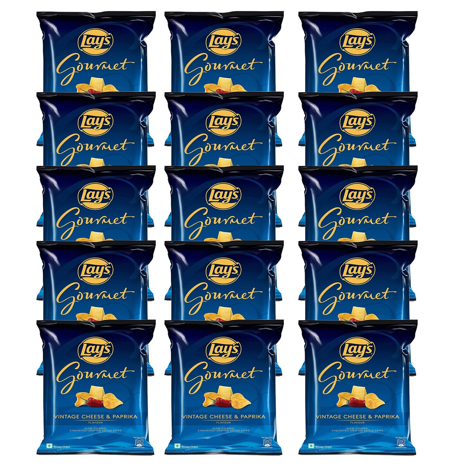 Introducing the new Premium Potato Chips, offering a rich crunch, cheesy, and a paprika flavorful bite! Crafted from meticulously selected, high-quality potatoes, Lay's Gourmet chips are infused with generous seasoning and unique blends of exotic ingredients, delivering a sensory delight with every bite. Each thickly sliced chip boasts a golden curl, offering an indulgent experience filled with lip-smacking flavors and enticing aromas, perfect for celebrating moments of indulgence. These chips are more than just cooked they are crafted to perfection, embodying the essence of fine snacking. Whether you're enjoying a movie night, traveling, or simply unwinding with friends or alone, these chips elevate any moment. Featuring the tantalizing Vintage Cheese and paprika flavor, each chip is slow-cooked to achieve an exquisite crunch, ensuring a satisfying texture in every bite. Crafted with handpicked quality potatoes, there's no compromise on taste or quality, a premium snacking experience. Ideal for cocktail parties, special occasions, or leisurely evenings, these chips pair seamlessly with cheese, dips, or your favorite beverages. Elevate your snacking experience with Lay's Gourmet Premium Potato Chips, and indulge in moments of pure culinary bliss. Features: Vintage Cheese and paprika Flavor Slow-cooked, exquisitely crafted kettle chips Handpicked quality potatoes An excellent snack for cocktail parties that pairs well with cheese dips INGREDIENTS Lays ChipsIDEAL FOR EVERY OCCASION: An exceptional premium snack, perfect for special occasions, beautifully complementing wine, cocktails, cheese, and dips for a delightful culinary experience. PREMIUM QUALITY: Lay's selects handpicked quality potatoes for every bag, ensuring no compromise on quality, delivering consistently delicious chips you can trust. CRAFTED CHIPS: Expertly slow-cooked kettle chips deliver a golden crunch, meticulously crafted for superior taste and texture. SPICY FLAVOUR: Lays Gourmet Vintage Cheese Paprika chip's feature an exquisite flavor, artfully enriched with distinctive spices for an unforgettable taste sensation. HARD-BITE CRUNCH: Thick potato slices, meticulously slow-cooked to achieve the perfect golden curl and a distinctive, satisfying crunch.