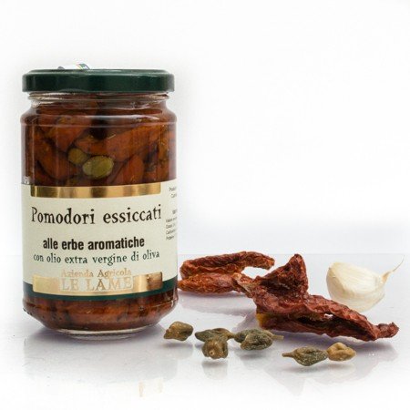 The sun-dried tomatoes from Le Lame farm are made just like they used to be. Their intense, concentrated flavor is achieved through the drying process. The tantalizing flavor of capers, along with oregano and garlic, is balanced to enhance the flavor of the tomatoes without overpowering them. The elongated, bright red tomatoes (San Marzano type), after being hand-picked in July and August, are washed, cut, salted, and sun-dried. The sun-dried tomatoes are then jarred with capers, oregano, and garlic, covered with extra virgin olive oil, and pasteurized. They are used in appetizers and side dishes, adding a touch of flavor to vegetable, rice, and potato salads, as well as in pizza and cold pasta dishes. We recommend seasoning them with the same extra virgin olive oil, sourced from the same Le Lame farm. INGREDIENTS Sun-dried tomatoes, extra virgin olive oil, sea salt, wine vinegar, capers, oregano, garlic.Pomodori Essiccati alle Erbe Aromatiche in Olio Extravergine di Oliva Prodotto Italiano – 3 Vasetti da 280grDESCRIPTION DU PRODUIT DESCRIPTION DU PRODUIT I Pomodori secchi dell'azienda agricola Le Lame, sono fatti proprio come una volta. Il sapore intenso e concentrato grazie al processo di essiccazione. Il gusto stuzzicante dei capperi insieme all origano e all aglio sono dosati in maniera equilibrata per esaltare il gusto del pomodoro senza coprirlo. I pomodori lunghi di colore rosso vivo tipo ( san marzano), dopo la raccolta manuale nei mesi di Luglio e Agosto, vengono lavati, tagliati, salati ed essiccati al sole.I Pomodori Secchi poi vengono invasati con aggiunta di capperi, origano, aglio e ricoperti con olio Extravergine di Oliva all'origine e pastorizzati. Si utilizzano nella realizzazione di antipasti e contorni, rendono appetitose le insalate di verdura, di riso e di patate ma anche nella pizza, e piatti di pasta fredda, consigliando di condire con lo stesso Olio Extravergine di Oliva, proveniente dalla stessa azienda agricola Le Lame. INGRÉDIENTS Pomodori secchi, Olio Extravergine di Oliva all' origine, sale marino, aceto di vino, capperi, origano, aglio.