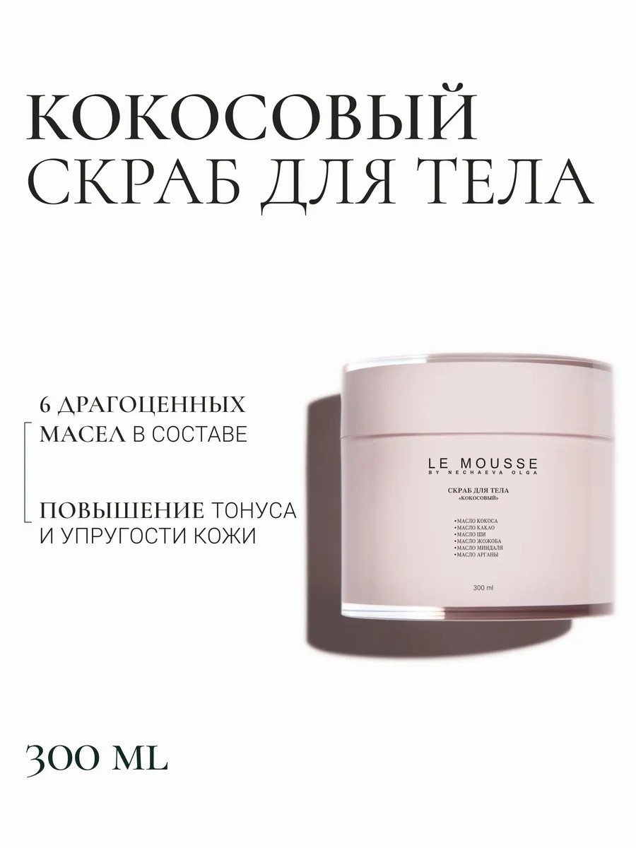 The scrub contains natural coconut flakes, salt and 6 precious oils that nourish the skin with fatty acids, improve the water-lipid balance of the skin and tighten it.