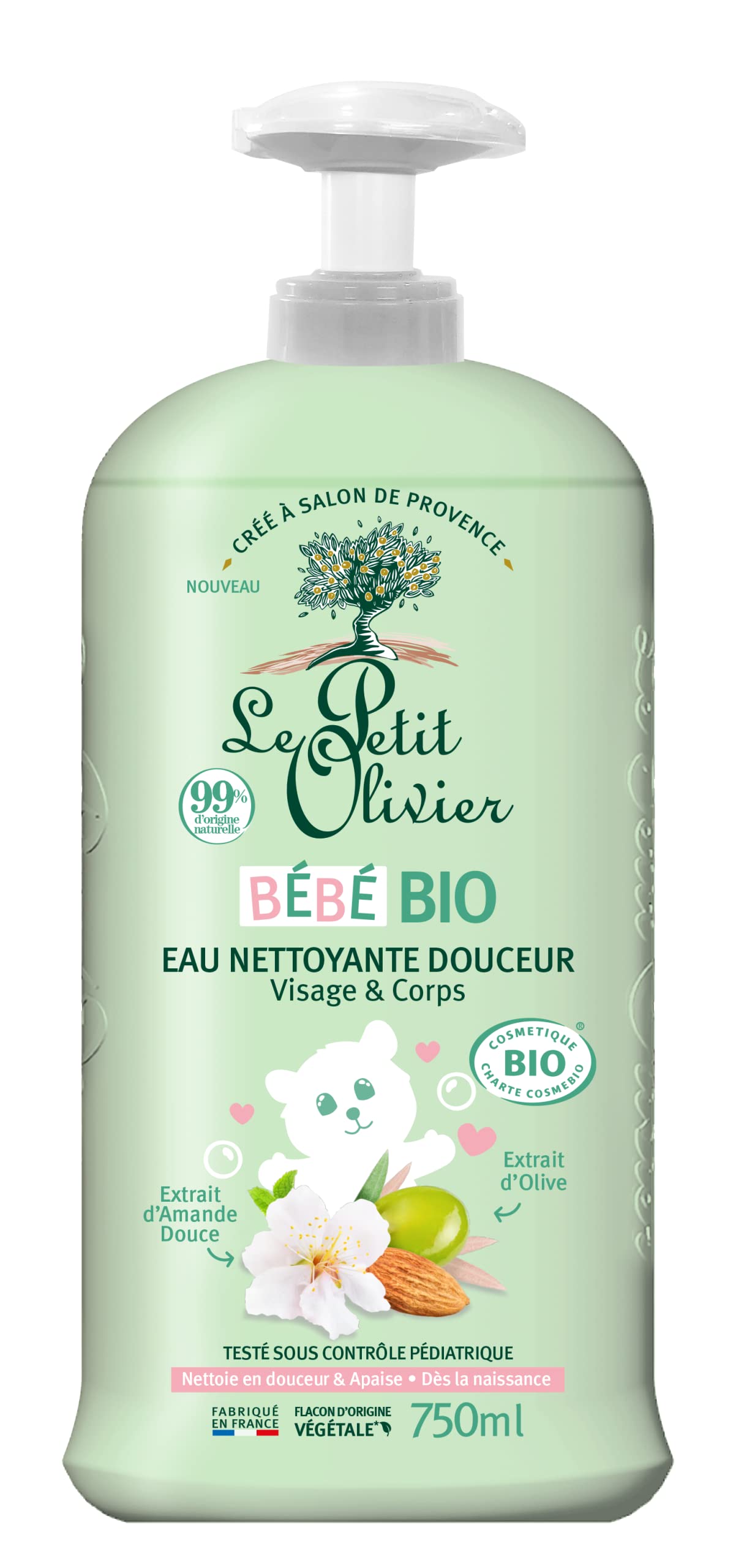 : Baby cleansing water with organic sweet almond and organic olive extracts. For face and body. Directions for use: Apply daily with a cotton pad to your baby's face, body, and bottom. No need to rinse. Le Petit Olivier, simply natural. At Le Petit Olivier, we strive every day to find the perfect balance between well-being, pleasure, sustainability, and effectiveness. All our products are made in France in Salon-de-Provence. Our fragrances come from the Grasse region. Certified One Voice since 2001 to combat animal testing, we are also committed to improving the environmental impact of our packaging by favoring eco-responsible alternatives. Our formulas include a high percentage of natural origin that meets a demanding internal formulation charter. We work our textures with care to take care of you and your skin, every day.A COMMITTED BRAND: The Le Petit Olivier Bébé range is tested under pediatric control, One Voice certified and made in France. The bottles in the range are of plant origin and recyclable. AN ECO-RESPONSIBLE APPROACH: Le Petit Olivier is committed to reducing its carbon footprint and waste production by offering large formats and bottles of plant origin. ORGANIC OLIVE AND ORGANIC SWEET ALMOND EXTRACTS FROM PROVENCE: Discover all the expertise of Le Petit Olivier in this gentle baby cleansing water with Provençal extracts and a soft and enveloping fragrance. 99 NATURAL ORIGIN: Formulated with 99 certified organic natural origin, this baby product contains no coloring or soap. Tested under pediatric control. A BABY WATER THAT GENTLY CLEANS: This cleansing water, with organic sweet almond and organic olive extracts, cleanses and soothes your baby's sensitive skin, leaving a soft, enveloping floral fragrance. Description produit : Eau nettoyante pour bébé aux extraits d'amande douce bio et d'olive bio. Pour visage et corps. Conseils d'utilisation : Appliquez quotidiennement à l'aide d'un coton sur le visage, le corps et le siège de votre bébé. Inutile de rincer. Le Petit Olivier, simplement nature. Chez Le Petit Olivier, nous cherchons chaque jour à trouver le parfait équilibre entre bien-être, plaisir, durabilité et efficacité. Tous nos produits sont fabriqués en France à Salon-de-Provence. Nos parfums sont issus de la région de Grasse. Certifiés One Voice depuis 2001 afin de lutter contre les tests sur les animaux, nous nous engageons également à améliorer l'impact environnemental de nos emballages en privilégiant des alternatives éco-responsables. Nos formules intègrent un fort pourcentage D'Origine naturelle répondant à une charte de formulation interne exigeante. Nous travaillons nos textures avec soin afin de prendre soin de vous et de votre peau, et ce, au quotidien.UNE MARQUE ENGAGÉE : La gamme Le Petit Olivier Bébé est testée sous contrôle pédiatrique, labellisée One Voice et fabriquée en France. Les flacons de la gamme sont d'origine végétale et recyclables. UNE DÉMARCHE ÉCO-RESPONSABLE : Le Petit Olivier s'engage à réduire son empreinte carbone et sa production de déchets en proposant de grands formats et des flacons d'origine végétale. EXTRAITS D'OLIVE BIO ET D'AMANDE DOUCE BIO DE PROVENCE: Retrouvez tout le savoir faire du Petit Olivier dans cette eau nettoyante douceur bébé aux extraits provençaux et au parfum doux et enveloppant. 99 D'ORIGINE NATURELLE : Formulé à 99 D'ORIGINE naturelle certifiés biologiques, ce produit pour bébé ne contient ni colorant, ni savon. Testé sous contrôle pédiatrique. UNE EAU POUR BÉBÉ QUI NETTOIE EN DOUCEUR : Cette eau lavante, aux extraits d'amande douce bio et d'olive bio, nettoie et apaise la peau sensible de votre bébé en laissant un doux parfum floral enveloppant.