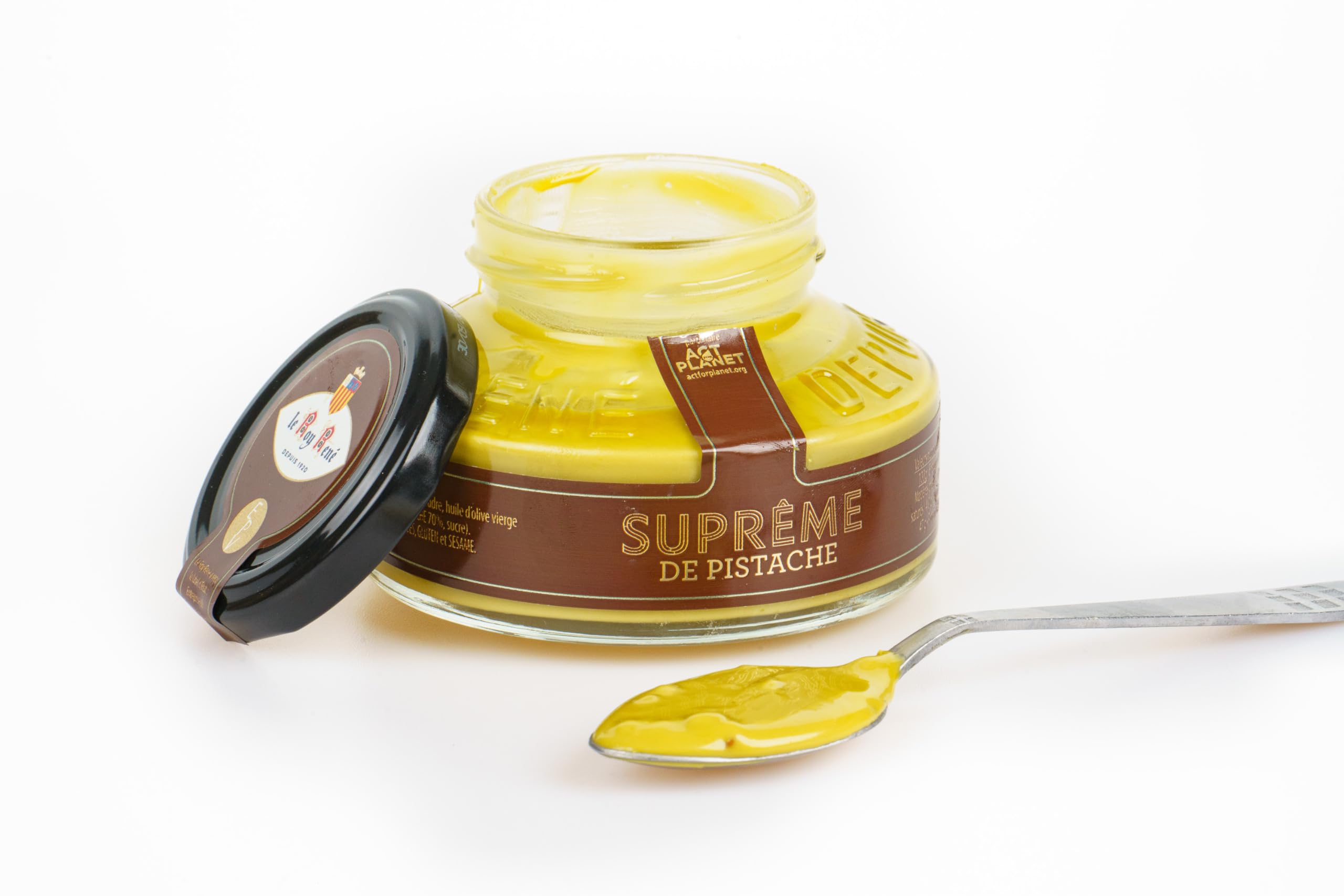 LE ROY RENE - an exceptional product - part of the Fine Food Boutique range, not available in supermarkets. Roy René Spreads: Roy René Pistachio Supreme. Pistachio Supreme offers a unique taste experience. This spread is traditionally made with high-quality pistachios and extra virgin olive oil. It is based on a 100 natural recipe, without palm oil or artificial flavorings. How to enjoy it? Spread it on bread for breakfast, enjoy it as an afternoon snack, or accompany your pastries and desserts. Founded in 1920 in Aix-en-Provence, Le Roy René is a family business specializing in Provençal confectionery. Now a century old, Maison Le Roy René has stood the test of time, perpetuating its expertise and the purity of its techniques. Le Roy René has always crafted its sweets using exceptional, meticulously selected raw materials. Let yourself be transported on a unique Provençal journey. Le Roy René is committed to supporting the Act For Planet association. Since 2019, Act for Planet has been working locally to combat the effects of climate change and its devastating impact on biodiversity. INGREDIENTS Sugar, pistachios 26 , skimmed milk powder, extra virgin olive oil, caramelized pistachio pieces 3 (pistachios 70 , sugar).LE ROY RENÉ Epicerie Fine - Délice à tartiner - Pâte à tartiner Suprême pot en verre (.) (Pistache 220g.)DESCRIPTION DU PRODUIT DESCRIPTION DU PRODUIT LE ROY RENE - produit d'exception - gamme Boutique Epicerie Fine, non disponible en grandes surfaces. Les tartinables du Roy René : Le suprême de pistache du Roy René. Le suprême de pistache offre une expérience gustative unique Cette douceur à tartiner est confectionnée traditionnellement à partir de pistaches de qualité et d'huile d'olive extra vierge. Elle est issue d'une recette 100 naturelle, sans huile de palme et sans arômes artificiels. Comment la déguster ? à tartiner au petit déjeuner à déguster pour le goûter pour accompagner vos pâtisseries et desserts Créée en 1920 à Aix-en-Provence, Le Roy René est une entreprise familiale, spécialisée dans la confection de confiseries provençales. Aujourd'hui centenaire, la Maison Le Roy René a traversé les époques en perpétuant ses savoir-faire, et la pureté de ses gestes. Depuis toujours, Le Roy René confectionne ses douceurs à l'aide de matières premières d'exception, sélectionnées méticuleusement. Laissez-vous transporter dans un voyage provençal unique. Le Roy René s'engage auprès de l'association Act For Planet. Depuis 2019, l'association Act for Planet agit localement pour lutter contre les effets du réchauffement climatique et ses effets dévastateurs sur la biodiversité. INGRÉDIENTS Sucre, pistache 26 , lait écrémé en poudre, huile d'olive vierge extra, éclats de pistaches caramélisées 3 (pistache 70 , sucre).