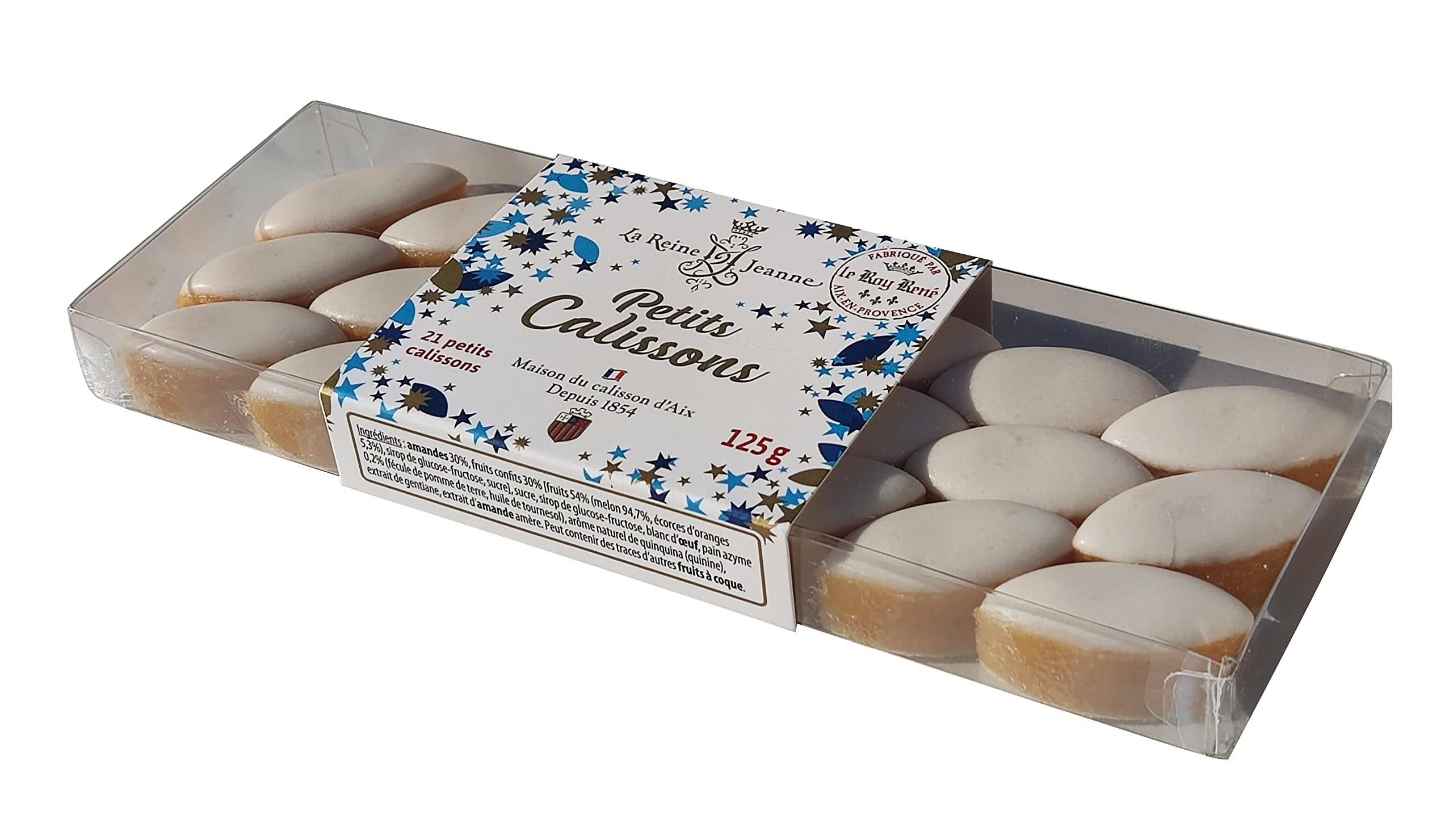 Calissons are available in a small size, perfect for any occasion. The small size is ideal for enjoying with tea or coffee during a relaxing break. Listed as part of the Living Heritage of the city of Aix-en-Provence, the history of the calisson dates back to the time of King René in the 15th century. Legend has it that the King's confectioner created this treat to delight Queen Jeanne on her wedding day. She named these delicacies "di calin soun" (meaning "they are hugs" in Provençal). INGREDIENTS Almonds 30 , candied fruit 30 [fruit 54 (melon 94.7 , orange peel 5.3 ), glucose-fructose syrup, sugar], sugar, glucose-fructose syrup, egg white, unleavened bread 0.2 (potato starch, sunflower oil), natural cinchona (quinine) flavoring, gentian extract, bitter almond extract. May contain traces of other nuts. Origins: Almonds (Spain), Melon [Provence (France)]. SAFETY WARNING Contains almonds, egg, and may contain traces of other nuts. See moreLe Roy René - Petits Calissons d'Aix en Provence La Reine Jeanne - Boîte réglette de 125g.DESCRIPTION DU PRODUIT DESCRIPTION DU PRODUIT Le Calisson se décline en petit format, et s'adapte aux différentes envies, le petit est idéal pour accompagner les pauses détente, thé ou café. Inscrit au Patrimoine vivant de la ville d'Aix-en-Provence, l'histoire du calisson remonte à l'époque du Roy René au XVe siècle. La légende raconte que le confiseur du Roy a réalisé cette friandise pour émerveiller la Reine Jeanne le jour de son mariage. Elle nomma ces délices "di calin soun" (ce sont des câlins en provençal). INGRÉDIENTS Amandes 30 , fruits confits 30 [fruits 54 (melon 94,7 , écorces d'oranges 5,3 ), sirop de glucose-fructose, sucre], sucre, sirop de glucose-fructose, blanc d'oeuf, pain azyme 0,2 (fécule de pomme de terre, huile de tournesol), arôme naturel de quinquina (quinine), extrait de gentiane, extrait d'amande amère. Peur contenir des traces d'autres fruits à coque. Origines : Amandes (Espagne), Melon [Provence (France)]. AVERTISSEMENT DE SÉCURITÉ Contient des amandes, de l'oeuf et peut contenir des traces d'autres fruits à coque. Voir plus