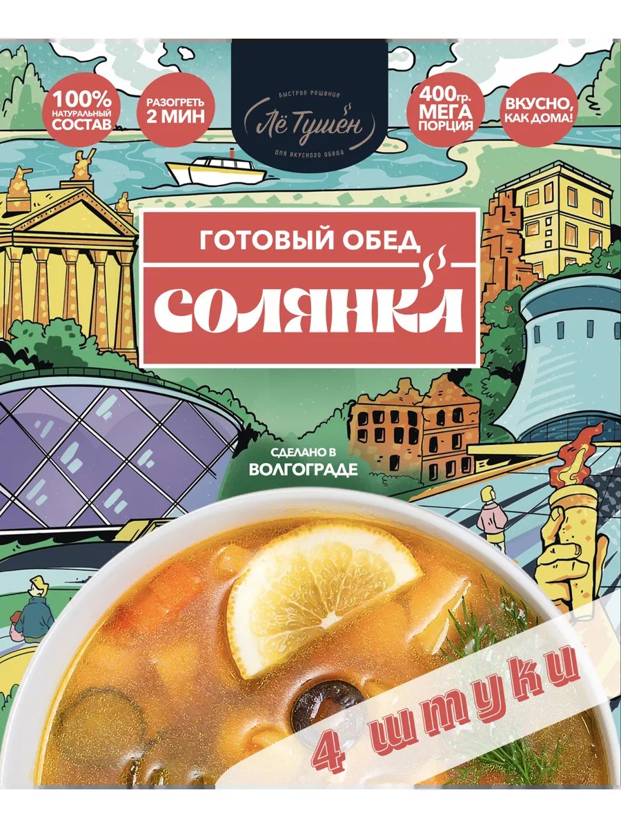 Solyanka is a soup made with a rich meat broth and various types of meat. If you're paying attention to your diet, maintaining a balance of proteins, fats, and carbohydrates, and want to consume a properly calculated amount of calories, then you've come to the right place. We present to you a set of four packages of solyanka soup from Le Touchon. It's the perfect choice for those who value taste and quality. Meat solyanka is rich in protein, B vitamins (B1, B2, B5, B6, B9, B12), C, and PP, and also contains macronutrients such as potassium, sodium, phosphorus, sulfur, and others. Along with these macronutrients, solyanka also contains micronutrients such as iron, zinc, copper, and others. The foil-lined soup pouches are GMO-free, contain no flavorings or thickeners, and are made from natural ingredients, making it not only delicious but also healthy. The nutritional value of the soup includes 5 g of protein, 4 g of fat, and 3 g of carbohydrates per 100 g, providing an energy value of 61 kcal. This simple and tasty soup is also aromatic and filling. Regular consumption improves digestion and cardiovascular health. Its microelements strengthen bone tissue, improve blood clotting, and stabilize cholesterol and glucose levels. This food is perfect for travel, hiking, traveling, exploring nature, fishing, and hunting. You can even reheat the dish hot in a bag in boiling water and enjoy it just like at home. Nothing extra—just taste and health. This ready-to-eat meal in a bag is a great way to enjoy a traditional Russian dish while maintaining a healthy lifestyle and being in tune with nature. This high-calorie soup is also convenient for hikers and a complete meal for a family feast for four as a first course. You can share the set and enjoy this delicious soup with coworkers without interrupting your work. Bon appétit!!! Wishing you Le-Tushion.