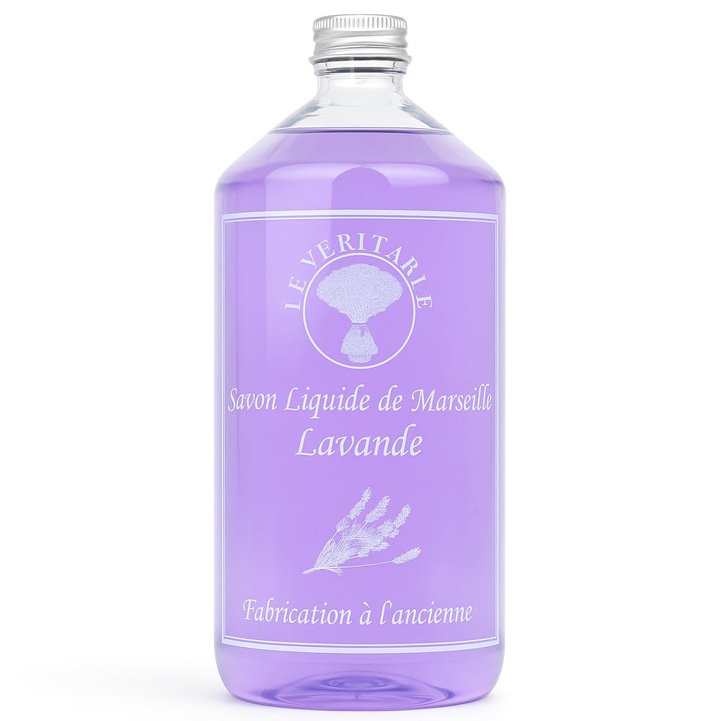Le Véritable - Savon Liquide de Marseille à la Lavande – 1 Litre – Format Familial – Naturel, Artisanal Vegan – Pour Mains et Corps – Sans Paraben, Sans Sulfates – Peaux Sensibles – Made in France