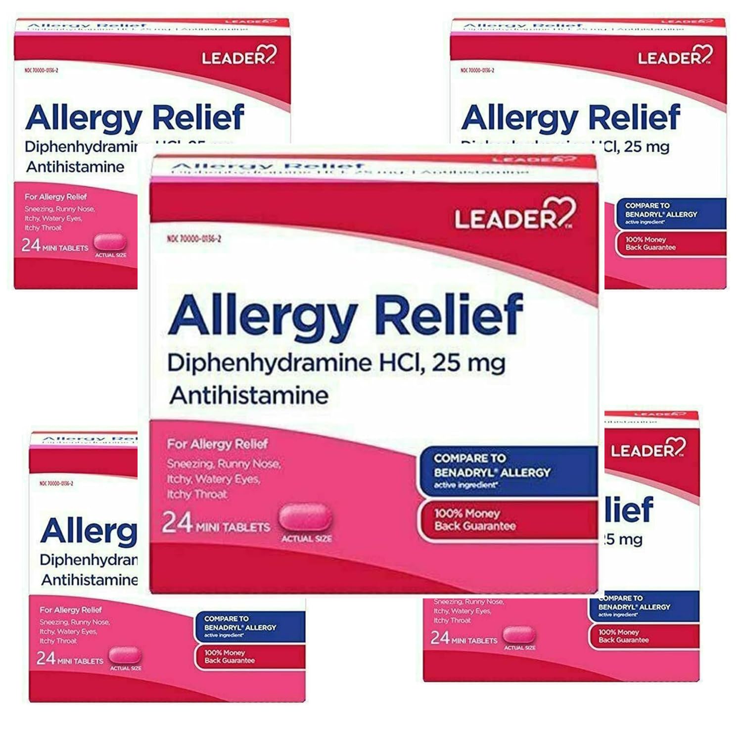 Leader Antihistamine Allergy Relief Diphenhydramine HCl 25mg Mini Tablets 24 Count Pack of 5