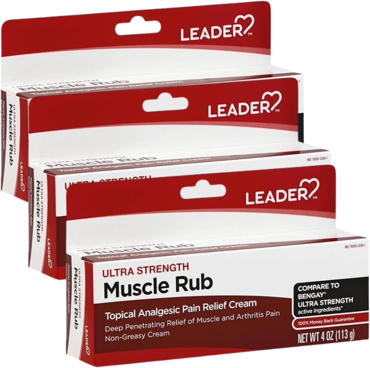 • ACTIVE INGREDIENT: LEADER Muscle Rub Topical analgesic contains three pain-relieving ingredients—camphor, menthol, and methyl salicylate, for ultra-strong relief in a non-greasy cream