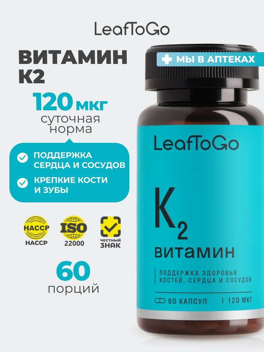 LeafToGo K2 витамины для костей зубов и сердца 60капс
