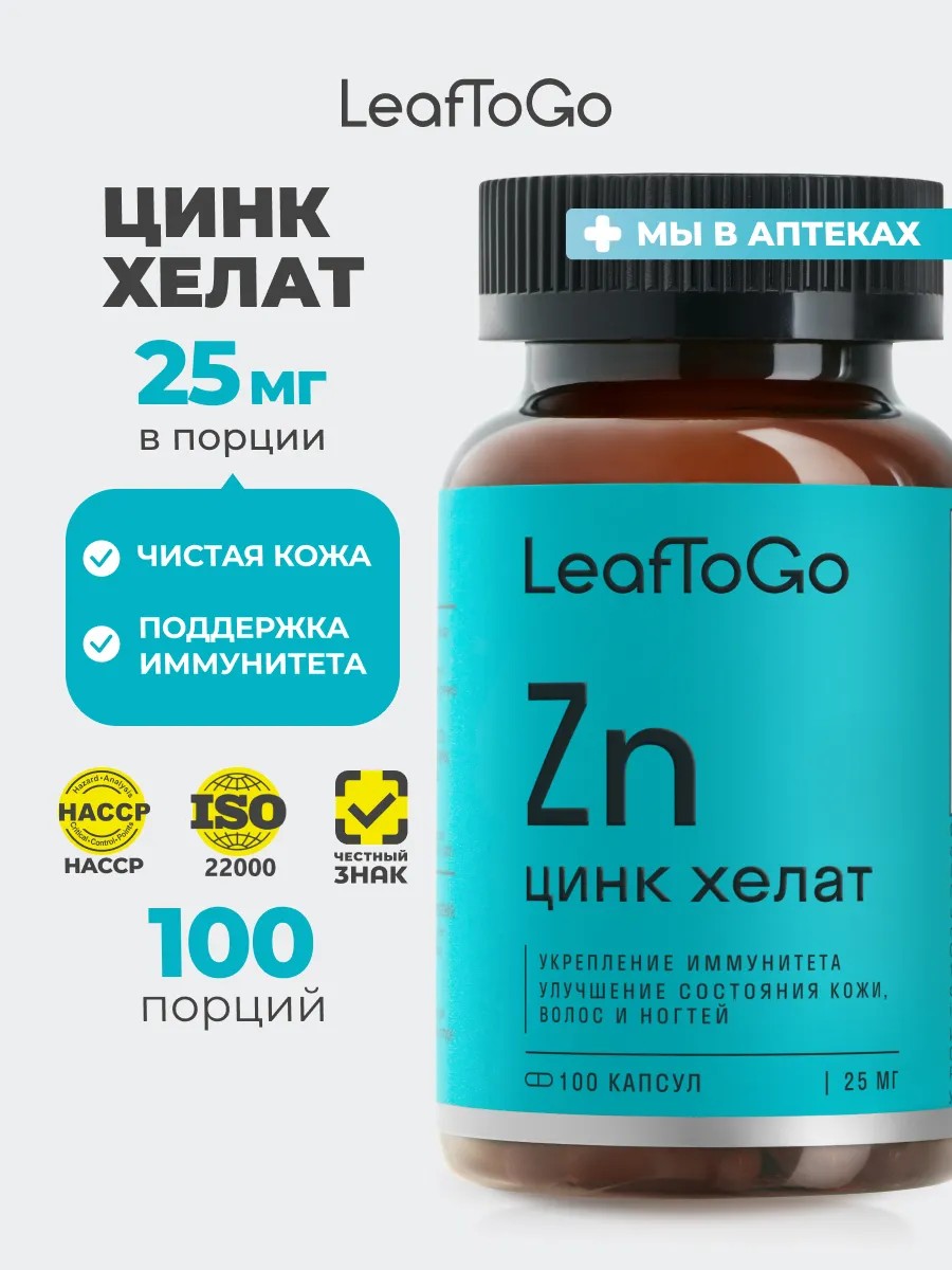 Цинк хелат 25 мг LeafToGo — высокоусвояемый цинк в хелатной форме для красивой кожи, иммунитета и гормонального баланса.