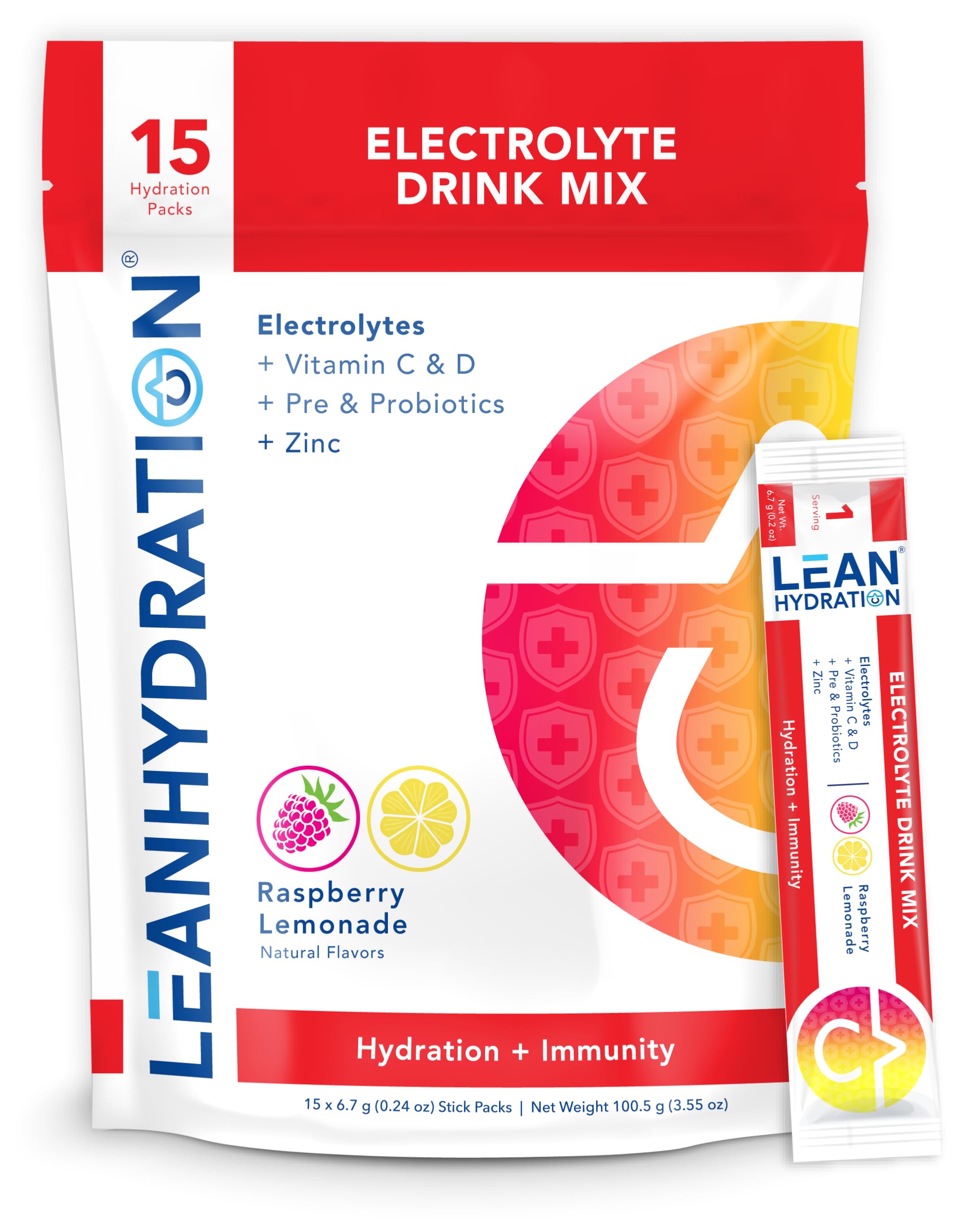 Introducing Lean Hydration Natural Immune Formula, the ultimate solution for boosting immunity while staying properly hydrated. Crafted with a powerful blend of immune-boosting ingredients and essential electrolytes, our formula is your key to optimal health and wellness. Our Natural Immune Formula is packed with potent ingredients like vitamin C and zinc known for their immune-boosting properties. By supporting your body's natural defenses, Lean Hydration helps you stay healthy and resilient, even during challenging times. But Lean Hydration isn't just about immune support – it also provides advanced hydration to keep you performing at your best. With essential electrolytes like potassium and magnesium, our formula replenishes lost fluids and helps prevent dehydration, so you can stay hydrated and energized throughout the day. And with natural energy boosters like B-vitamins, Lean Hydration delivers sustained energy without the crash or jitters. Whether you're hitting the gym, going for a run, or simply staying active, our formula provides the clean energy you need to power through your day. Plus, with zero sugar and zero calories, Lean Hydration is the perfect choice for those looking to maintain a healthy lifestyle without sacrificing taste or enjoyment. Choose from a variety of delicious flavors, including naturally flavored and sweetened Cranapple and Raspberry Lemonade, to make hydration a refreshing and satisfying experience. Boost your immunity and stay hydrated with Lean Hydration Natural Immune Formula – the perfect blend of health and hydration for a happier, healthier you.QUALITY GUARANTEED: LEAN Hydration products are proudly made in the USA in state-of-the-art manufacturing facilities that adhere to the highest standards for quality, using only tested, safe and effective ingredients that you can use with total confidence that we stand behind with our goal to make Every – Body - Better. Refreshing Flavors: Choose from a variety of naturally flavored and sweetened mouthwatering flavors to make hydration enjoyable and satisfying. EVERYTHING YOU NEED – NOTHING YOU DON'T: We've included only the best ingredients that you need for ultimate hydration and recovery without any of the unnecessary things that you don't want like added sugar or excessive amounts of sodium. Our proven hydrating ingredients include 700 mg of electrolytes with effective doses of Potassium, Magnesium, Pink Himalayan Sea Salt, Vitamin D, Vitamin C, B Vitamins, and LEAN Supporting Decaffeinated Green Tea Extract. Zero Sugar, 5 Calories: Guilt-free hydration with a delicious, sugar-free formula that won't compromise your health goals. Immune Support: Formulated with natural immune-boosting ingredients like vitamin C and zinc to strengthen your body's defenses. Advanced Hydration: Stay properly hydrated with essential electrolytes while supporting your immune system with every sip. Clean Energy: Enjoy sustained energy without the crash, thanks to natural ingredients like B-vitamins.