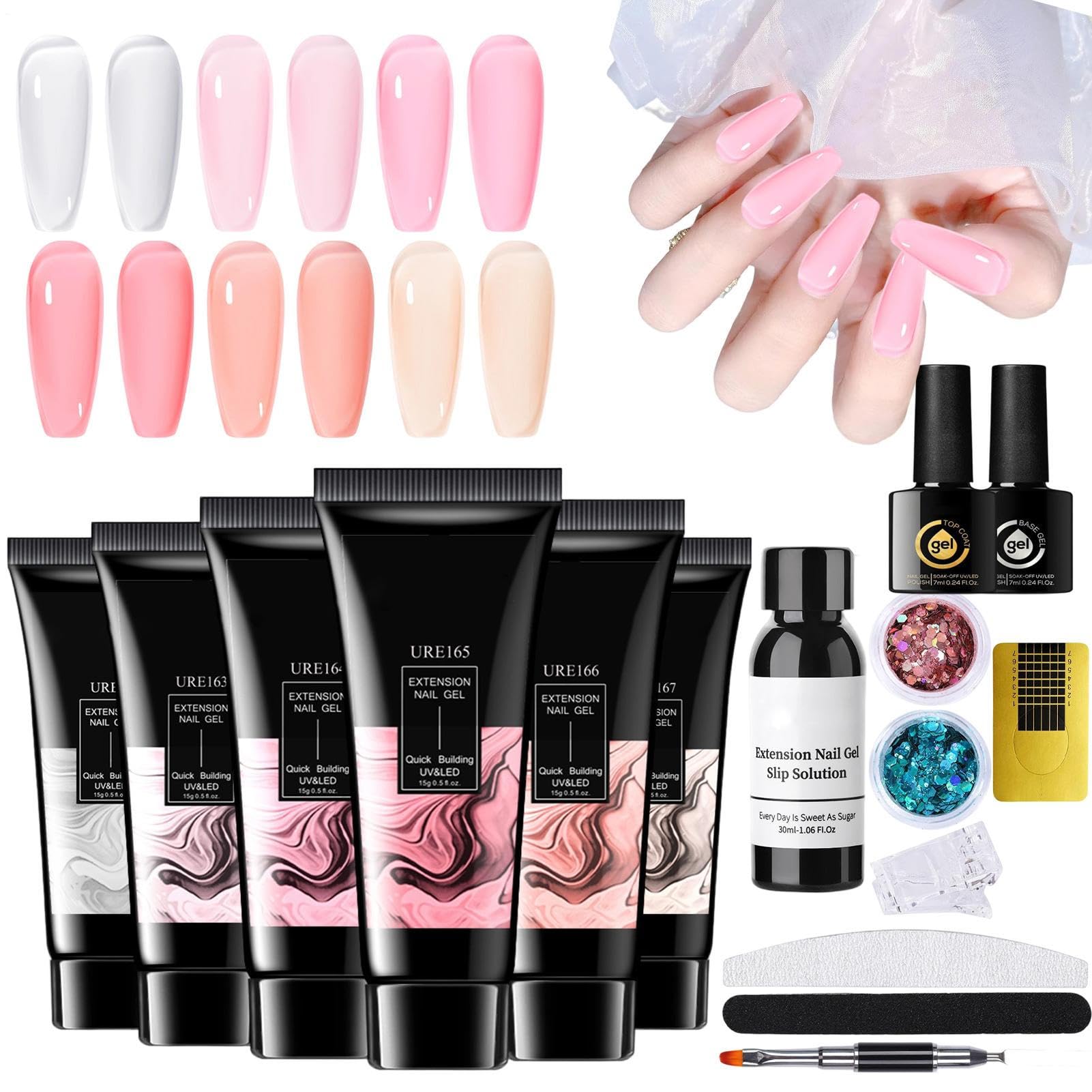 Beginners Welcome: Achieve salon-quality nails at home with this affordable kit. Includes 6 extension gels, a base coat, and all the necessary tools for easy application and stunning results. Optimal Nail Preparation: Achieve optimal results by thoroughly drying surfaces and properly preparing nails for better adhesion of the nail extension gel. Ensure a smooth hold and easy removal with adjustable curing time, combined with regular maintenance through filing and cleaning. Long-Lasting Formula: 6 trendy colors with a sheer to clear finish guarantee extended wear. Allows for long-lasting nail creations for stylish looks without frequent touch-ups. Adaptive Gel Designs: Enjoy a flexible gel texture with powerful reinforcement while allowing for artistic French sculpting and captivating 3D nail designs on natural nails. Enhanced Adhesion: Exclusive base and top coat technology provides long-lasting wear without breakage. Delivers a consistent shine for weeks with regular use thanks to its increased resistance to daily wear and tear.