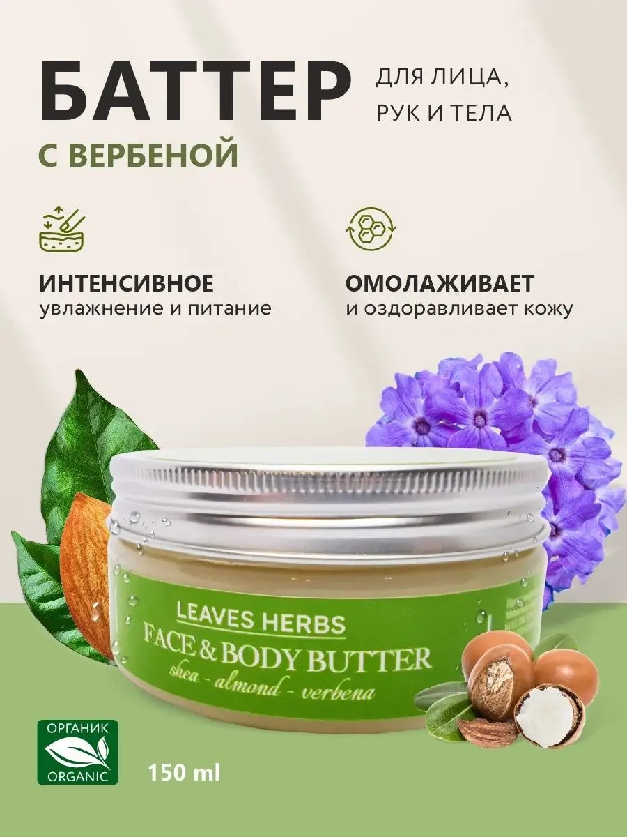 Подарите себе натуральный уход за телом с питательным баттером LEAVES & HERBS. Легкий крем-баттер для тела, рук и лица питает и увлажняет кожу, быстро впитывается и дарит ощущение комфорта и легкости. Богатый и насыщенный цветочный аромат зарядит энергией и хорошим настроением! Маслянистая тающая текстура butter легко распределяется, обогащает кожу питательными веществами и увлажняет даже очень сухую кожу, разглаживает морщинки и устраняет растяжки. Его великолепная текстура позволяет ухаживать за кожей тела, губ лица, рук и стоп, без ощущения липкости и жирного блеска, при этом придавая коже приятный аромат вербены. Подходит для всех типов кожи. Можно использовать для массажа и в качестве питающей основы или маски.