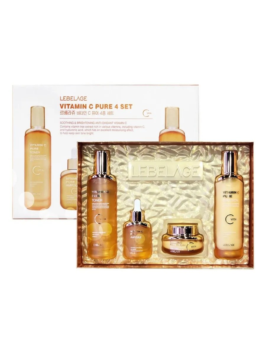 Антивозрастной набор для ухода за кожей лица от Lebelage богат витамином С и гиалуроновой кислотой, обладает превосходным увлажняющим эффектом, помогает сохранить яркий тон кожи.Состав набора:Lebelage Тонер для лица с витамином С / Vitamin C Pure Toner, 120 млОбладает отличным антиоксидантным действием, помогая сохранить яркий тон кожи. Транексамовая кислота сохраняет кожу яркой, предотвращая пигментацию меланина в коже.Способ применения: После умывания утром и вечером возьмите необходимое количество содержимого на ватный диск или ладонь и нанесите на все лицо легкими постукиванием.Lebelage Эмульсия для лица с витамином С / Vitamin C Pure Emulsion, 120 млЭмульсия с витаминами и транексамовой кислотой обновляет, смягчает, восстанавливает поврежденную кожу, обладает заметным омолаживающим эффектом. Транексамовая кислота устраняет тусклый цвет, выравнивает тон кожи и обновляет. Эмульсия подходит для всех типов кожи, но особенно рекомендуется для тусклой, неровной, уставшей.Способ применения:Нанести эмульсию легкими круговыми движениями до полного впитывания на очищенную кожу лица и шеи утром и вечером.Lebelage Крем с витамином С / Vitamin C Pure Cream, 55 млКрем для лица с витамином С заряжает кожу энергией, насыщает её витаминами, повышает тонус и значительно улучшает цвет лица. Этот крем идеальное решение в рамках ухода за тусклой и серой кожей, которая нуждается в восстановлении свежего и яркого тона. Средство содержит витамин С в микрокапсулах, который оживляет тусклую и уставшую кожу.Витаминно-фруктовый коктейль насыщает её полезными микро- и макро- элементами, осветляет нежелательную пигментацию, не вызывая раздражения. Крем для лица доставляет в клетки кожи необходимое количество влаги, за счёт чего лицо выглядит более ухоженным, свежим и отдохнувшим.Способ применения:На последнем этапе ухода за кожей возьмите необходимое количество содержимого, аккуратно распределите его по текстуре кожи и слегка похлопайте для впитывания.