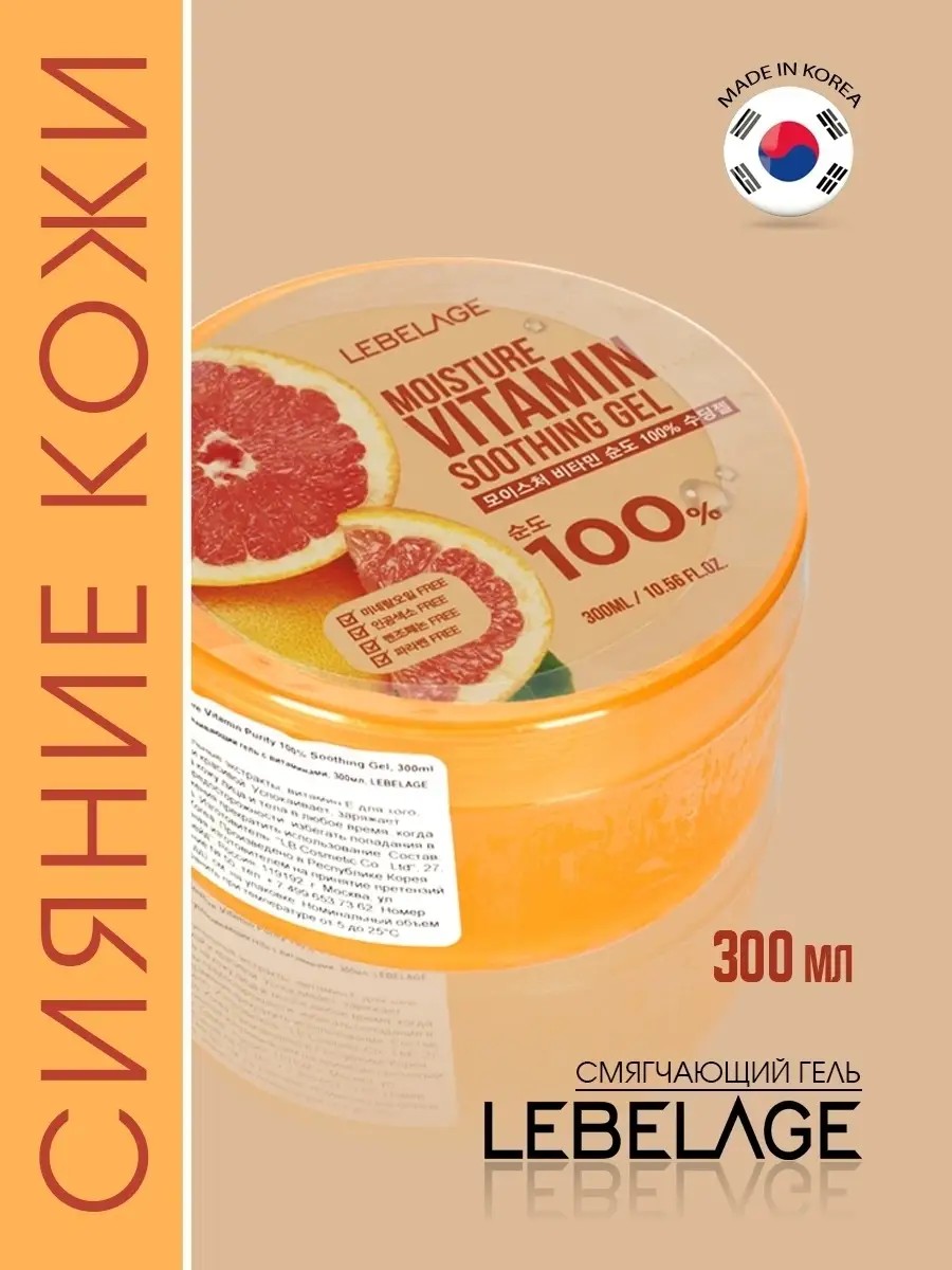 Lebelage Moisture Vitamin Soothing Gel 300 ml Гель увлажняющий и успокаивающий с витаминами для мужского и женского ухода за кожей лица и тела, Корея, 300 мл. Корейская косметика для ухода за собой для женщин и мужчин. Многофункциональный гель с витаминами увлажняет, питает кожу полезными веществами, успокаивает раздражения и покраснения. Подавляет воздействие свободных радикалов, приводящих к старению кожи. Витамины защищают эпидермис от внешних негативных факторов, укрепляют стенки клеток и образуют гидрофобный барьер, устраняя сухость. Экстракт листьев камелии китайской увлажняет и питает эпидермис, успокаивает раздражения, улучшает тон и способствует заживлению, регенерации поврежденных участков. Может использоваться в качестве основы под макияж ; как дневная и ночная маска для увлажнения и успокоения раздражений ; как гель для массажа ; как средство после укуса насекомых, загара и ожогов, после бритья. Благодаря легкой текстуре быстро впитывается и не оставляет ощущения сухости или липкости. Подходит для всех типов кожи, в том числе для проблемной и чувствительной. Применение: наносить на лицо и тело легкими движениями. Повторяйте по мере необходимости для приятного увлажнения и дополнительного питания кожи. Корейский универсальный гель станет идеальным подарком женщине - маме, подруге, девушке любимой на день рождения, новый год, 8 марта, день Святого Валентина или мужчине - папе, другу, любимому на 14 и 23 февраля. Рекомендуется к использованию в комплексе с серией корейской косметики для ухода за лицом и телом Lebelage.