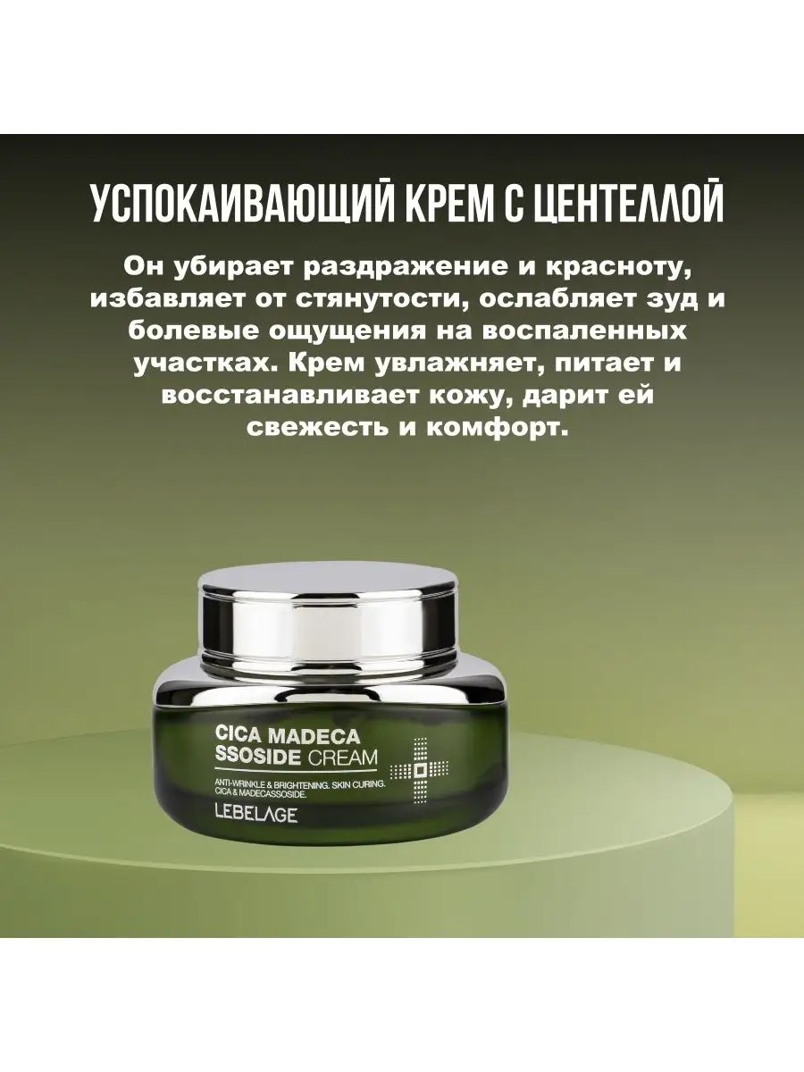 Lebelage Крем для лица успокаивающий с экстрактом центеллы азиатской и мадекассосида CICA MADECASSOSIDE CREAM, 55мл. Ампульный крем Cica Madecassoside Cream из каталога Lebelage разработан для активного ухода за возрастной, чувствительной, поврежденной кожей лица. Средство с биоактивными веществами центеллы азиатской и мадекасоссидом, бетаином и гиалуроновой кислотой обладает противовоспалительными, заживляющими, омолаживающими качествами. Попадая на кожу, крем активно впитывается, не оставляя следов липкости или жирности. Проникающие в толщу эпидермиса полезные вещества, стимулируют собственный клеточный иммунитет, подталкивают регенерацию, увлажняют покровы, оздоравливают и разглаживают кожу, избавляют ее от шелушения, покраснений и иных проблем. Успокаивающий крем с центеллой азиатской разглаживает морщины, смягчает, выравнивает, улучшает внешний вид кожи. Экстракт центеллы азиатской и мадекасоссид эффективно успокаивают, устраняют повреждения, ускоряют процессы восстановления. Крем подходит для всех типов кожи, но особенно рекомендуется для чувствительной. СПОСОБ ПРИМЕНЕНИЯ: Нанести крем в качестве завершающего этапа в ежедневном уходе.