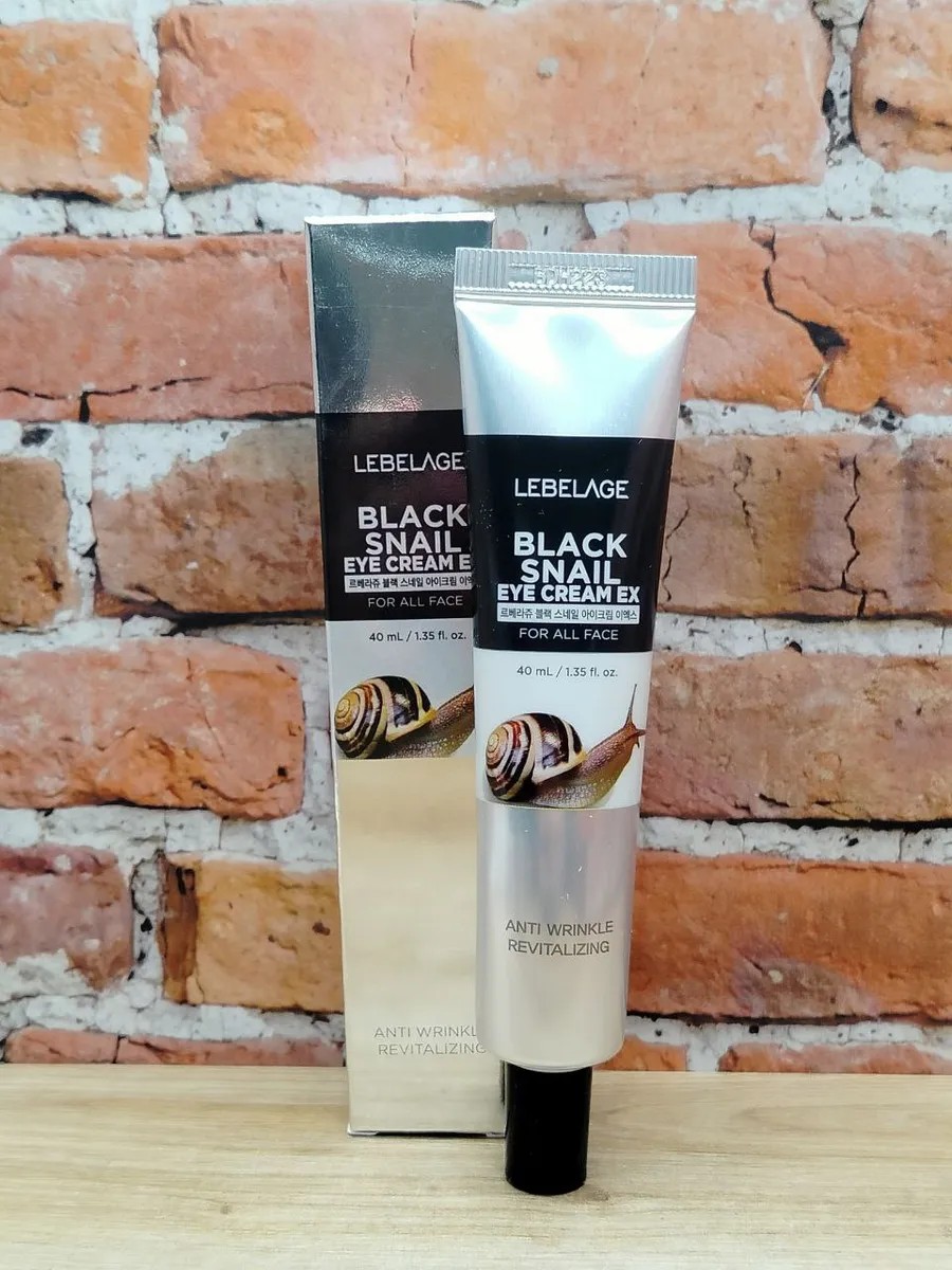 LEBELAGE (Корейская косметика) BLACK SNAIL EYE CREAM EX 40мл - корейский крем для век и кожи вокруг глаз с муцином улитки и легкой текстурой. Крем для век корея - незаменимое средство в борьбе с первыми признаками старения кожи. Крем для глаз от морщин - увлажняет, питает и омолаживает, делая вашу кожу молодой и сияющей. Корейская технология лифтинга позволяет активным компонентам проникать глубоко в кожу век, способствуя повышению упругости и эластичности. Сочетание гиалуронового крема и муцина улитки делает крем еще более эффективным в борьбе с морщинами и темными кругами под глазами. Разглаживающий крем для глаз с муцином улитки и экстрактом центеллы предназначен для ухода за кожей вокруг глаз, даже самой нежной и чувствительной. Муцин, выделяемый улитками, содержит мощные питательные вещества, такие как гликопротеины, гиалуроновая кислота, антиоксиданты и витамины. Он способствует увлажнению, питанию и регенерации кожи, помогая сделать ее более упругой, гладкой и молодой.  Центелла азиатская (центелла) известна своими успокаивающими и заживляющими свойствами. Экстракт центеллы помогает ускорить процессы регенерации клеток кожи, уменьшить воспаления, улучшить цвет лица и сделать кожу более эластичной.  Крем помогает бороться с морщинами, тонкими линиями, отечностью и темными кругами под глазами, делая кожу более упругой и гладкой. Благодаря своим увлажняющим свойствам и антиоксидантам, крем обеспечивает интенсивное увлажнение кожи, защищая ее от негативного воздействия окружающей среды и преждевременного старения. Регулярное использование крема способствует омолаживанию кожи вокруг глаз, делая ее более упругой, сияющей и здоровой. Разглаживающий крем предназначен для того, чтобы подарить вашей коже вокруг глаз интенсивный уход, борясь с признаками старения, уставшим видом и делая ваш взгляд более ярким и молодым.
