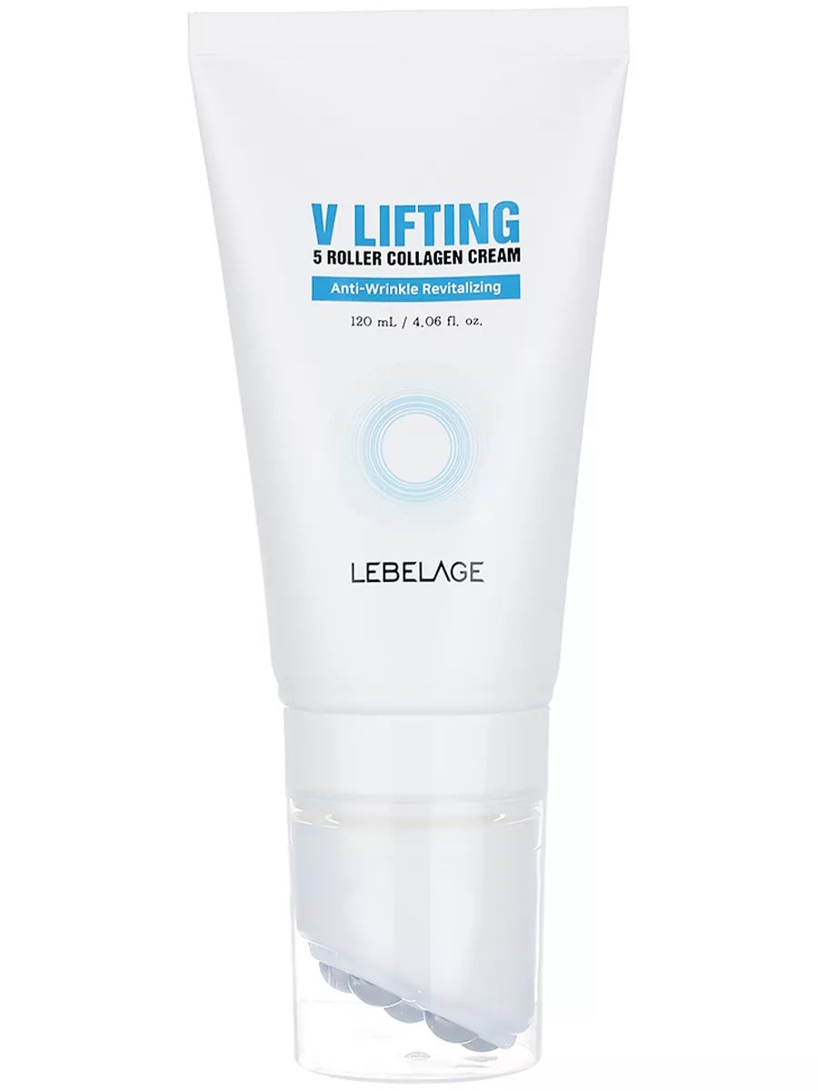 This collagen lifting roller cream moisturizes, improves circulation, and simultaneously conditions the skin with 5 massage rollers. Hydrolyzed collagen helps smooth out the skin's microrelief, smooth out wrinkles, and improve firmness and elasticity. The massage rollers help create a more defined chin and face line. How to use: 1. Turn the "ON-OFF" part toward "ON." 2. Squeeze out the required amount and distribute evenly. 3. Using the roller, gently massage the body and allow it to be absorbed. // Lebelage V Lifting 5 Roller Collagen Cream, 120 ml