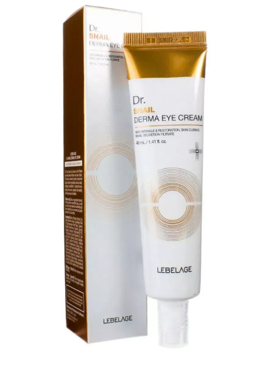 Lebelage Derma Eye Cream Dr. Snail, Крем для области вокруг глаз антивозрастной с Улиточным муцином 40 мл. Оказывает увлажняющее, смягчающее, разглаживающее действие, способствует восстановлению поврежденных участков кожи, а также обеспечивает надежную защиту от негативных внешних факторов. Средство проникает в глубокие слои эпидермиса и повышает уровень влаги в кожи, улучшает эластичность и устраняет отеки. Благодаря легкому отбеливающему действию крем осветляет темные круги под глазами, а пигментацию делает менее заметной. Главными действующими компонентами крема являются фильтрат слизи улитки и прополис, которые повышают защитный барьер, борются с раздражениями и возрастными изменениями кожи. При регулярном использовании средство способно уменьшить глубину морщин и сделать их менее заметными, разгладить кожный рельеф и ускорить процессы регенерации в клетках кожи.