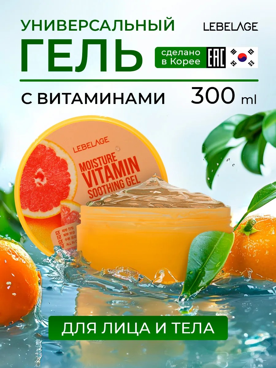 Moisturizing soothing facial skin care gel with vitamins, Korean cosmetics. 300 ml. Multifunctional gel for face and body skin care from Korea with vitamins suppresses the effects of free radicals that lead to skin aging. Vitamins protect the skin from negative external influences, strengthen cell walls and form a hydrophobic barrier. Can be used not only as a gel, but also as a makeup base and mask. Thanks to its light texture, it can be used for both day and night care. Suitable for all skin types, including problematic and sensitive. Use as a makeup base; as a light night and day cream; as a regular mask; as a refreshing body gel, after shaving and epilation; after sunburn and burns. An ideal gift for a woman, mother, friend, or girlfriend for a birthday, New Year, March 8th, or Valentine's Day. Recommended for use in combination with the Lebelage line of Korean facial and body care products. This multifunctional vitamin gel can serve as an effective moisturizer for the face and body, as well as a makeup base, a face and hair mask, a cuticle softener, and an after-sun soothing treatment. Directions: Apply to clean, dry skin until completely absorbed.