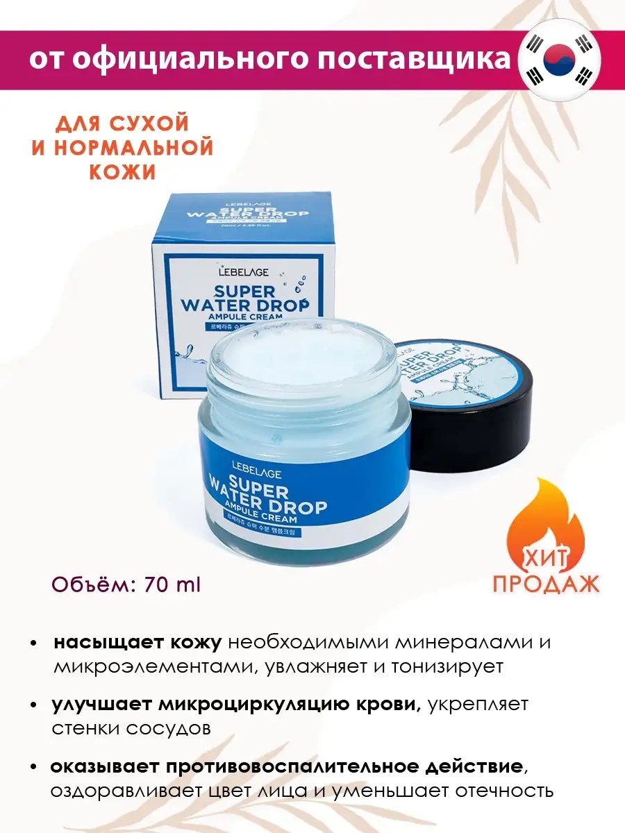 Ampule Cream Super Aqua, an intensely moisturizing ampoule cream with sea water, 70 ml. Lebelage Ampule Cream Super Aqua is an essential product for dry skin suffering from dehydration. This moisturizing face cream not only saturates the skin with moisture but also restores its protective functions. This product is especially necessary for those who frequently visit a solarium or pool, helps after intensive cosmetic procedures, and protects the skin during trips to hot climates. This face cream contains sea water, which saturates the skin with essential minerals and microelements, moisturizes and tones the skin, improves microcirculation, and reduces facial puffiness. Also included is centella asiatica extract, which has amazing properties and affects the skin in several ways: it has anti-inflammatory and wound-healing effects, and strengthens blood vessel walls. Centella extract stimulates collagen synthesis, resulting in skin rejuvenation, making it more elastic and firm, and reducing the depth of wrinkles.