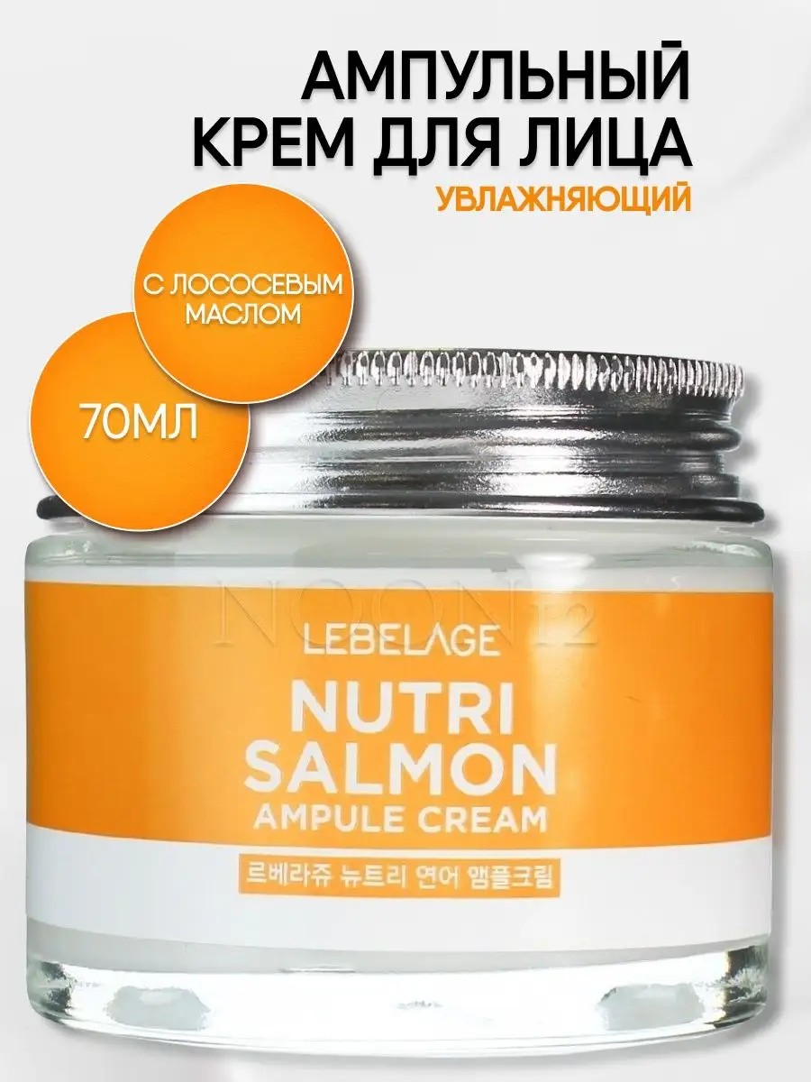 LEBELAGE AMPULE CREAM NUTRI SALMON - Korean ampoule face cream. The cream's key ingredient is salmon oil, a source of valuable omega-3 fatty acids, which provides powerful regenerative properties, helps maintain lipid balance, and protects the skin from dehydration, thereby slowing the aging process and the appearance of wrinkles. This salmon oil cream provides intense nourishment, eliminates dryness and flaking, and improves skin firmness and elasticity. HOW TO USE: Apply the cream as the final step of your skincare routine. Use morning and/or evening.