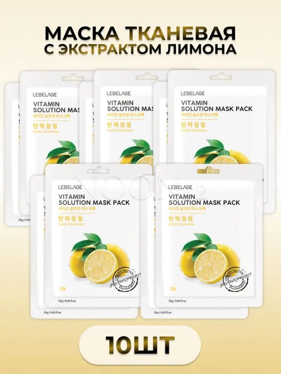LEBELAGE VITAMIN SOLUTION MASK 10 pcs. These cleansing and brightening sheet masks will quickly restore smoothness, tone, and refresh your skin. This acid-rich face mask contains lemon, anat, fig, and mulberry extracts, which promote deep cleansing of the epidermis from dead skin cells, provide a powerful antibacterial effect, and accelerate the healing of wounds and minor skin damage. Lemon has brightening properties; it inhibits melanin production and effectively combats age spots, mattifies, and tightens pores. APPLICATION: Apply the mask to cleansed skin, leave on for 10-20 minutes, and distribute the remaining essence over the skin.